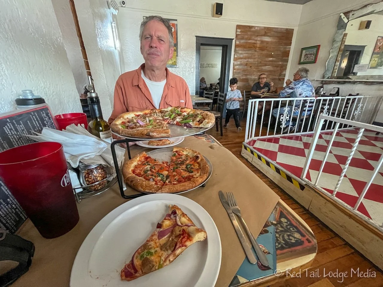 When we were finished wandering down most of the walkways of the Old Town, we ducked into the Old Town Pizza Parlor for an early dinner. It was a busy little place. We had very typical pizzas for us, a margarita pizza for Keith while Ann ordered sausage, peppers, and onions on hers. The pizza was tasty. It was not as good as Dewey’s Pizza, our new found favorite from the week before in Kansas City on our way to Santa Fe (Santa Fe, New Mexico - October 5th to 6th, 2023), but it was a good New York style crust. They were even kind enough to fill our water bottles for us before we started our ride back.