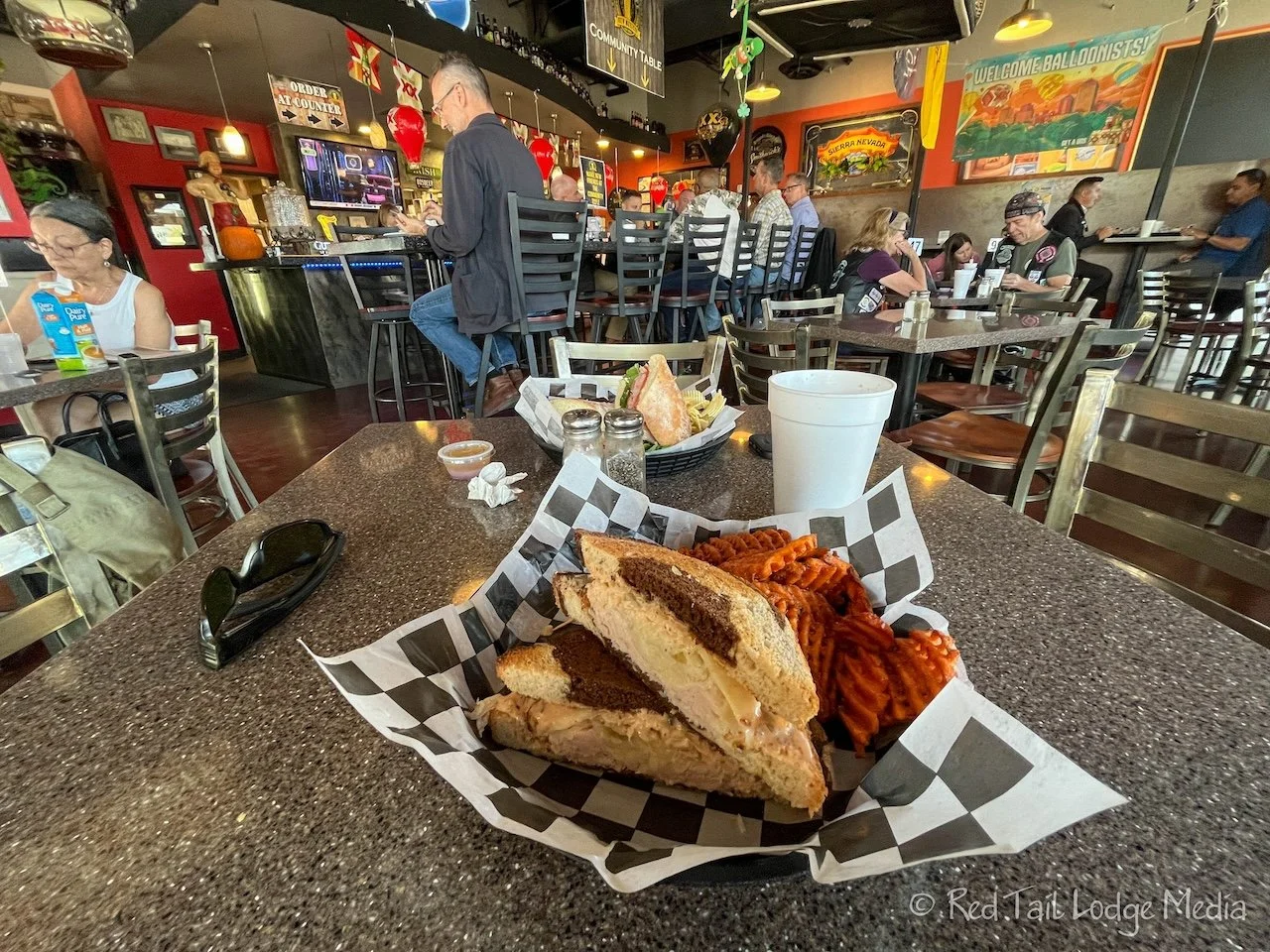 The Thursday morning Mass Ascension was cancelled due to high winds. Even though the winds had not yet started up near the ground, the cold front was already overhead and there were 50 mph winds up higher. A couple of hours later, the winds picked up and were strong all day. We stayed inside our rig most of the day. To stretch our legs, we walked over to Oak Tree Cafe for lunch. This time we had craft sandwiches instead of burgers. Ann wanted a reuben, but they were out of corned beef. Instead she had the Rachel, which is a reuben with turkey instead of corned beef. It was pretty tasty, with a good amount of sauerkraut, just the way she likes it. Keith had the Al Capone, which had ham, salami, pepperoni, and provolone on a baguette. Ann ordered sweet potato fries again, but this time they were waffle fries. They were still delicious.