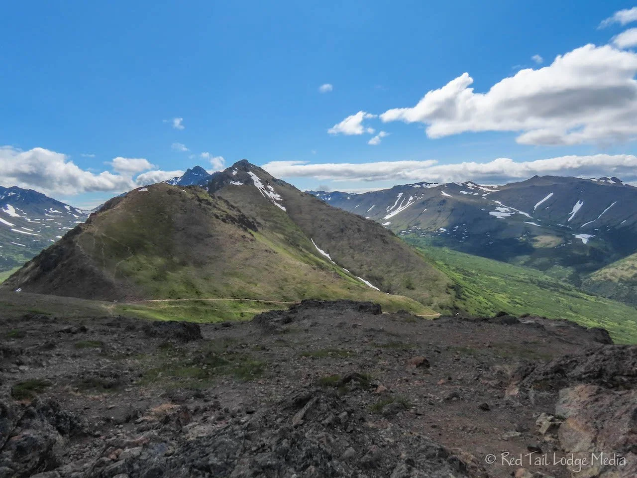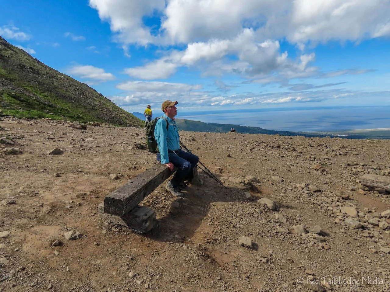 The top of the mountain is flat, just like its name suggests. You can easily walk around on the summit and get beautiful views in all directions. In one direction, you can see downtown Anchorage and out to Cook Inlet. In the other directions are mountain peaks with patches of snow. A flag pole with an American flag is at the top of the scramble, which gives you something to aim for during your climb and gives you a nice photo op once you reach it to prove you made it.