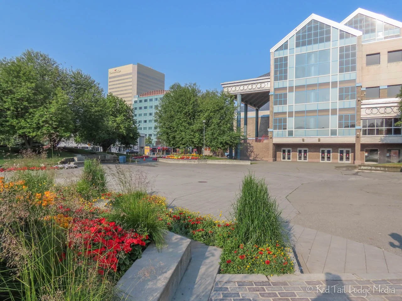 We had a 7 am appointment on Wednesday with the Ford dealer to have our Red Tail Lodge (our van) serviced. It was due for an oil change and tire rotation. We also had them replace the engine air filter, since we’re sure it was full of dust from all the dirt and gravel roads we had been on. While it was being serviced, we walked to downtown Anchorage, a couple of miles away. For the first little ways, we followed the Chester Creek Trail in the trees alongside a creek. Then we headed north on A Street.