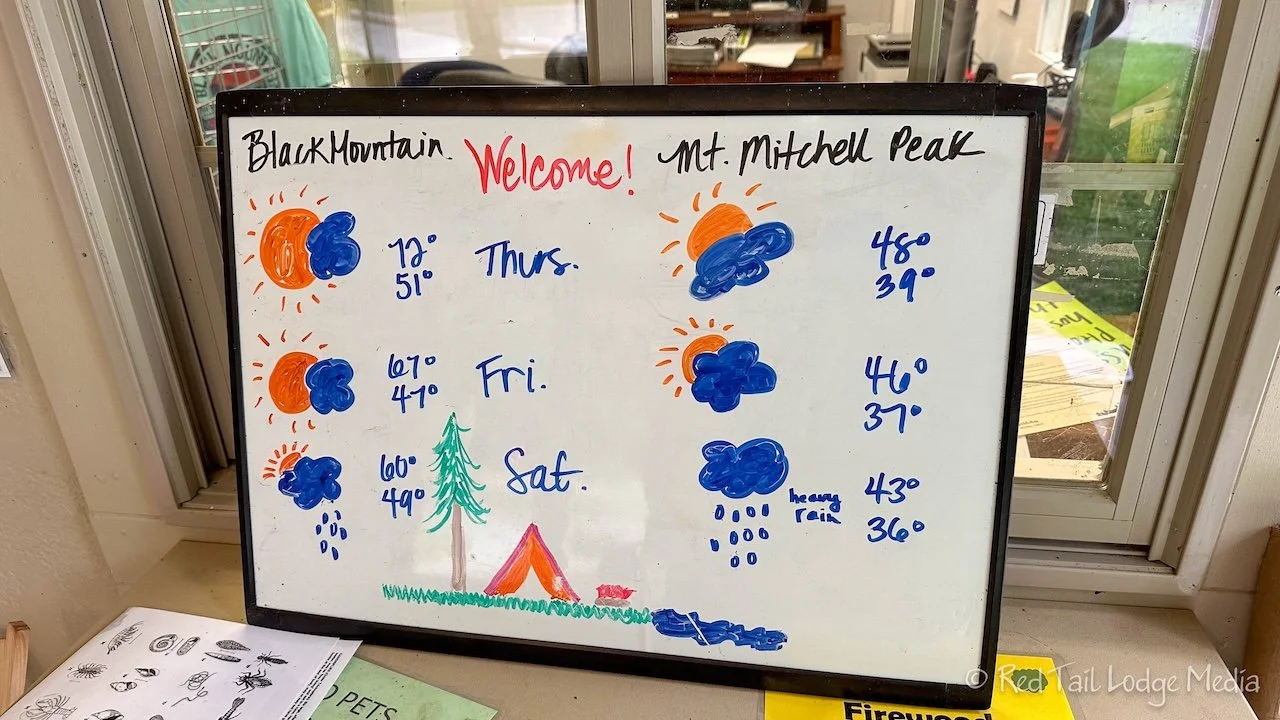 Candy and Kevin were the campground managers. They work for Find Outdoors, who is contracted by the National Forest Service. We stopped and chatted with Candy at the campground office. She was very helpful. There is no cell service at the campground, but the host gets a detailed weather forecast for both the campground and up at the peak of Mt. Mitchell and posts it outside the campground office. Our main goal for our stay was to see the top of Mt. Mitchell on a clear day. We had visited it twice two years ago during our visit to the Blue Ridge Parkway. However, both times it was socked in, with zero visibility. The following day, Friday, was the only day during our stay that was not predicted to have rain. Our host also informed us that we should go in the morning, because clouds were predicted for the afternoon at the peak.