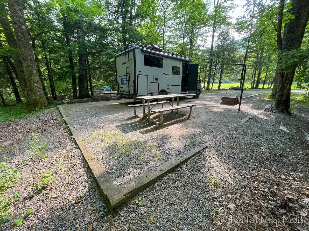 A light rain started as we drove back to the campground. We were a little concerned that we would fill up our cassette toilet on Sunday, as it was supposed to rain all day long. That meant we would probably be using our own toilet all day, instead of using the campground bathhouse. Normally, the cassette will last us four days, but that’s if we only use it after dark. We didn’t see a dump station on the campground map and decided to stop and ask our friendly host if there was a dump station nearby. No sooner than we discussed that, Ann spotted a small dump station sign at the sharp bend in the dirt road, just a mile from the campground. We turned down the small dirt road and followed it around about 50 yards. Then there it was, a dump station all by itself, with nothing else around. We’re guessing it was located there so it was far enough away from the river and in a convenient location for the several Pisgah National Forest camp sites and campgrounds in the area. Whatever the reason, we were glad Ann spotted it.