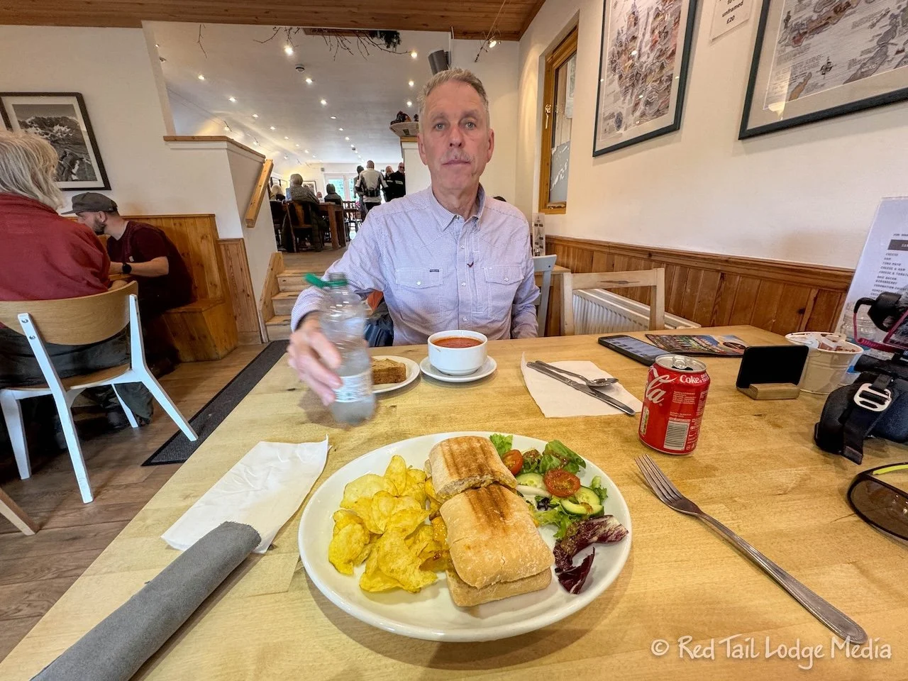 We made two stops to break up the drive and for needed potty breaks. The first stop was at the Midge Bite Cafe in Achnasheen. For some reason, they were not serving food that day but they did have drinks and bakes (pastries). Keith had a cappuccino along with a Midge Bite flapjack. Ann had a chai latte with her dark chocolate tiffin. A tiffin is a non-baked dessert with crushed biscuits (cookies) covered with melted chocolate, then cooled. This one had white chocolate chips on top. It really satisfied Ann’s chocolate cravings without being overly rich or sweet. Delicious.