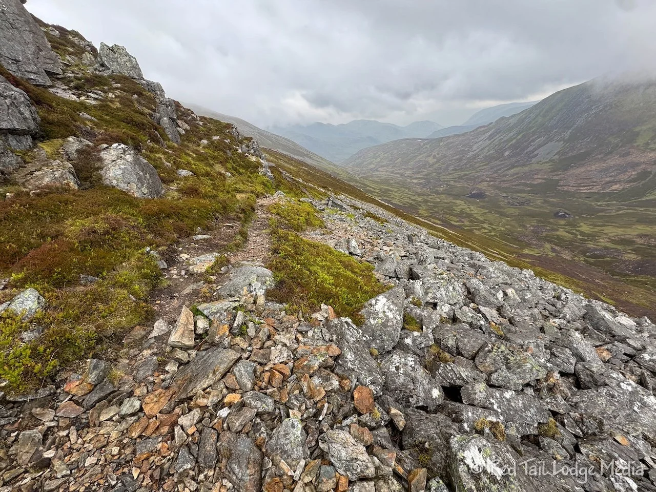 The climb up to the peak of Meall a’ Bhuachaille was steep, but the footing was pretty good. In the steepest sections, which was the majority of the climb, there were nicely maintained stone stairs. At the top, there was a stone cairn along with a circular stone wall for a wind break. Everyone seemed to be taking advantage of the wind break and sat down for a meal or snack inside the circle. We were in the minority, as we didn’t have a dog with us.