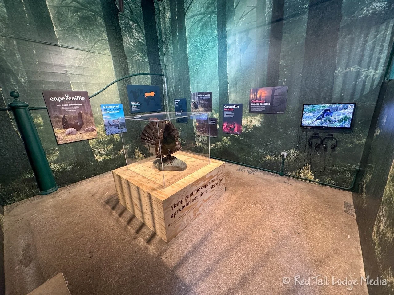 We walked behind the gift shop, over to the Capercaillie display to see what that was about. The Capercaillie is a large grouse. In the United Kingdom, they are only found in parts of Scotland, but they also inhabit northern parts of Europe and Asia. The Scottish population had become extinct, but was repopulated from the Swedish population. They reside in mature conifer forests. About 80% of the UK’s capercaillie population resides in the Cairngorms National Park, including the Balmoral Castle estate.