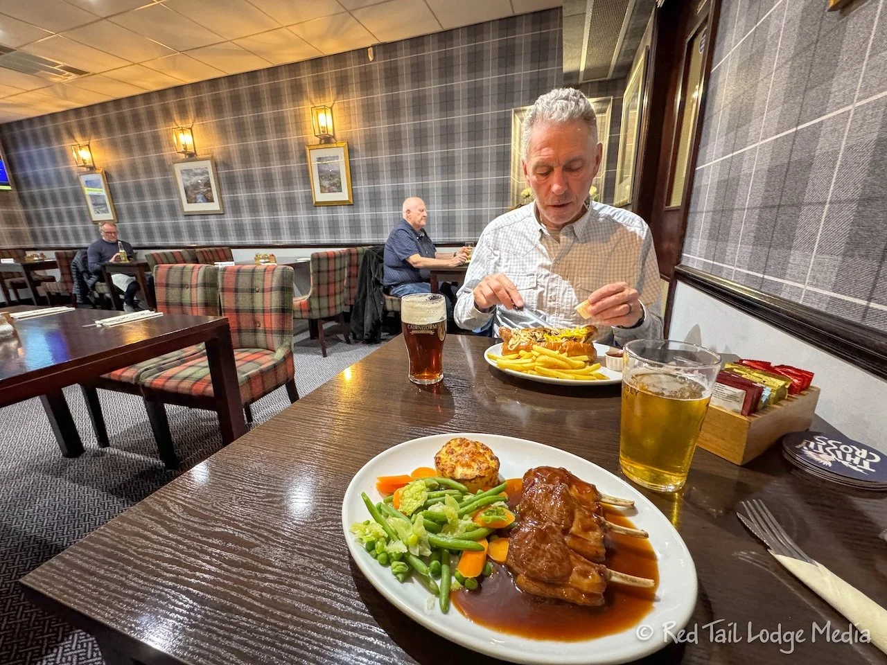Keith was doing some foreshadowing by ordering the bratwurst with fried onions and fries. Ann had the lamb cutlets with mixed vegetables and potato gratin in a red wine sauce. To drink, Ann had a Thistly Cross cider from West Barns, Scotland while Keith drank a dark ale from Cairngorm Brewery in Aviemore. Everything was pretty tasty.