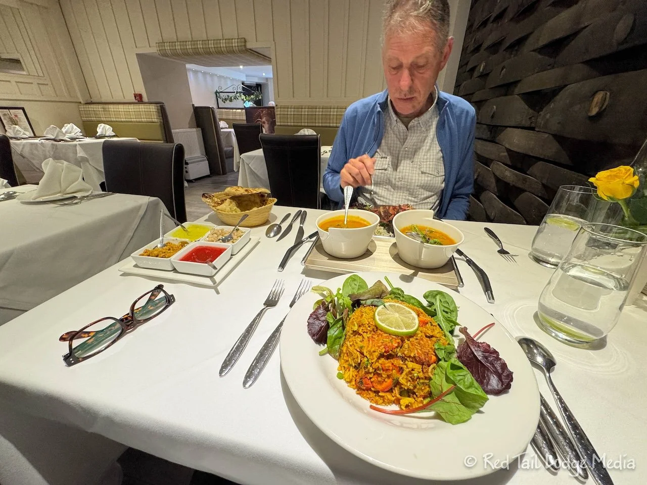 Ann ordered the coronation chicken ciabatta while Keith had the tomato and pepper soup. Coronation chicken is an English dish which was created for the coronation of Queen Elizabeth II in 1953. The chicken is seasoned with parsley, thyme, bay leaf, cumin, turmeric, ginger, and peppercorns, then mixed with cream or mayonnaise along with dried apricots or sultanas (white grapes). It was pretty tasty.