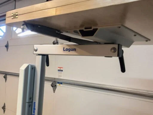At this point, we realized that the table extensions needed more support when the table top was open; the two hinges on each side were not enough. Left Buddy (LB) found some Metal Drop Leaf Supports (paid link) on Amazon. Ideally LB wanted to center the supports, front to back, under the main table top, but the Lagun mounting plate was in the way. So LB opted to offset the supports to one side of the mounting plate.
