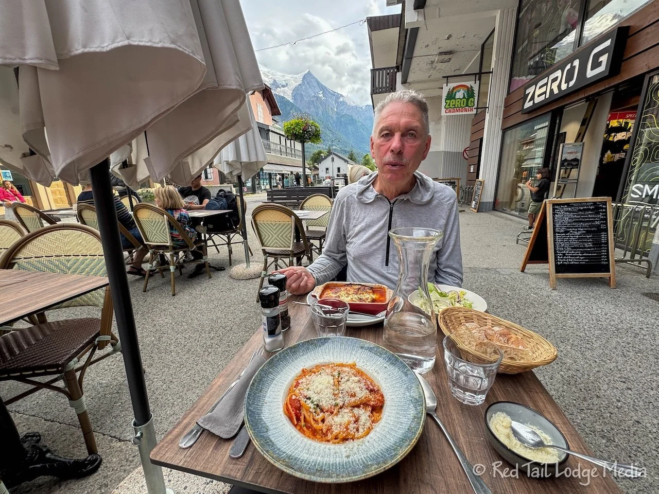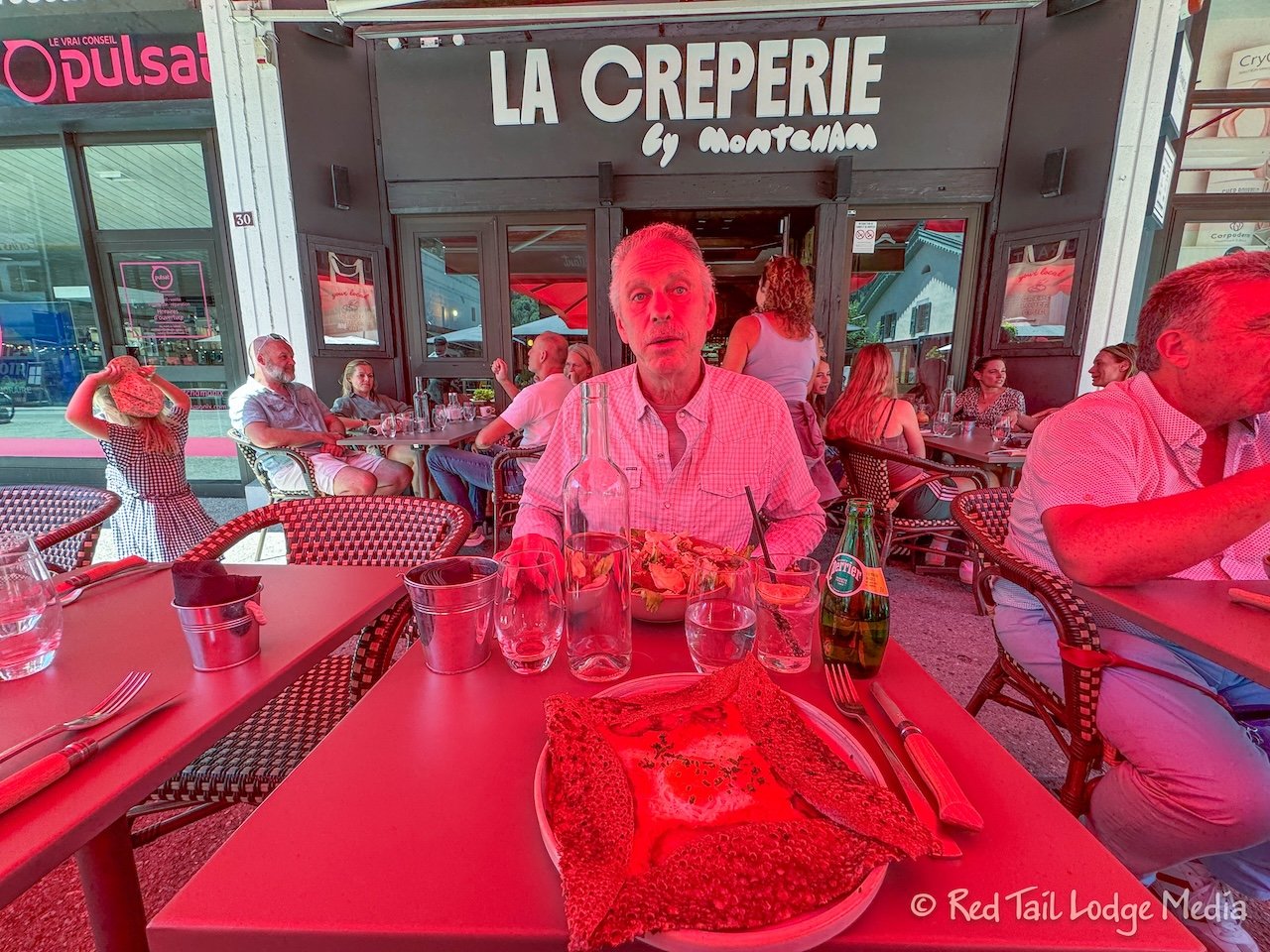 For lunch, we ate at La Crêperie by Montcham. Keith had the Savoyarde salad while Ann tried the Traversée Ibérique galette. The salad came with cheese on top of little triangular chips of buckwheat, potatoes, and bacon. Ann tried galettes before, back in York, England (York, England - May 20th to 22nd and June 20th to 23rd, 2025), but this one was different. The one in York was served more like a handheld, while this one in Chamonix was served flat on a plate, with the edges folded in. A galette is similar to a crèpe, but savory and made with buckwheat flour. The Traversée Ibérique, which translates to Iberian Crossing, came with chorizo, fried egg, comté cheese, and a roasted pepper cream. It was delicious.