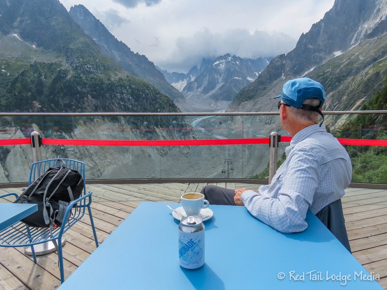 After visiting the ice cave, we bought a couple of drinks at one of the restaurants. We drink them outside, enjoying the views of the glacier and the waterfalls. Then we took the train back to Chanonix.