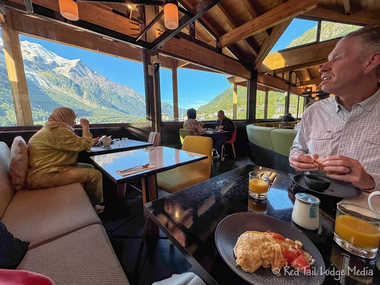 Breakfast at Alpina Eclectic was a wonderful buffet, with a chef making eggs to order. The buffet is up on the 7th floor, with a wall of windows giving you a wonderful view of the city and the mountain peaks. Paragliders were already making their morning flights, giving us a show while we ate.