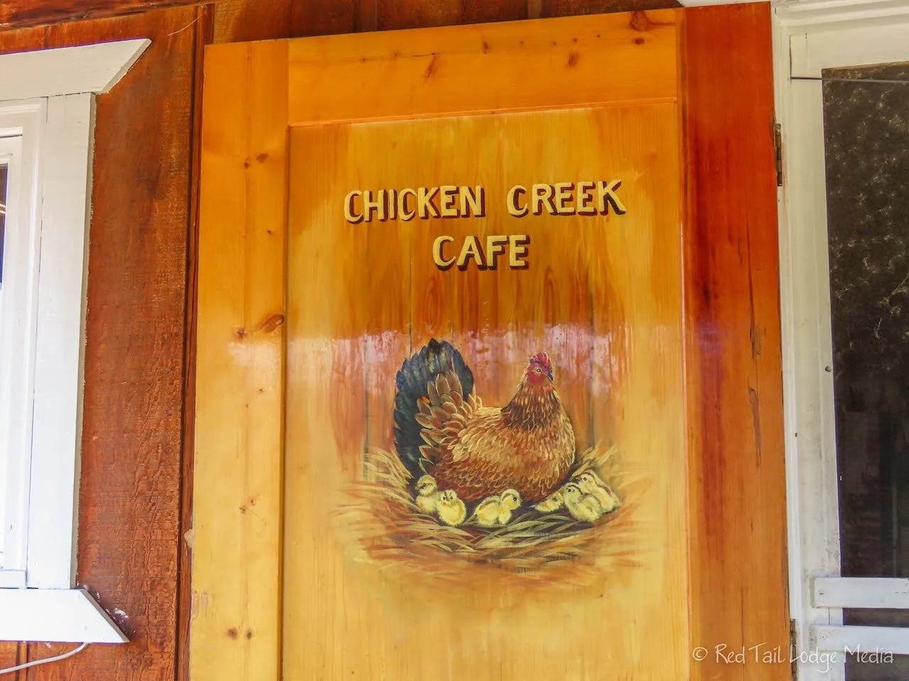 A short walk back up Airport Road is Downtown Chicken. That’s what they call it, but it is just one building that houses the Mercantile Emporium (gift shop), the liquor store, the Chicken Creek Saloon, and the Chicken Creek Cafe. It was the only building we saw that is not on the property of the two campgrounds in town. They also have a single gas pump, selling gas for $5.59 per gallon.