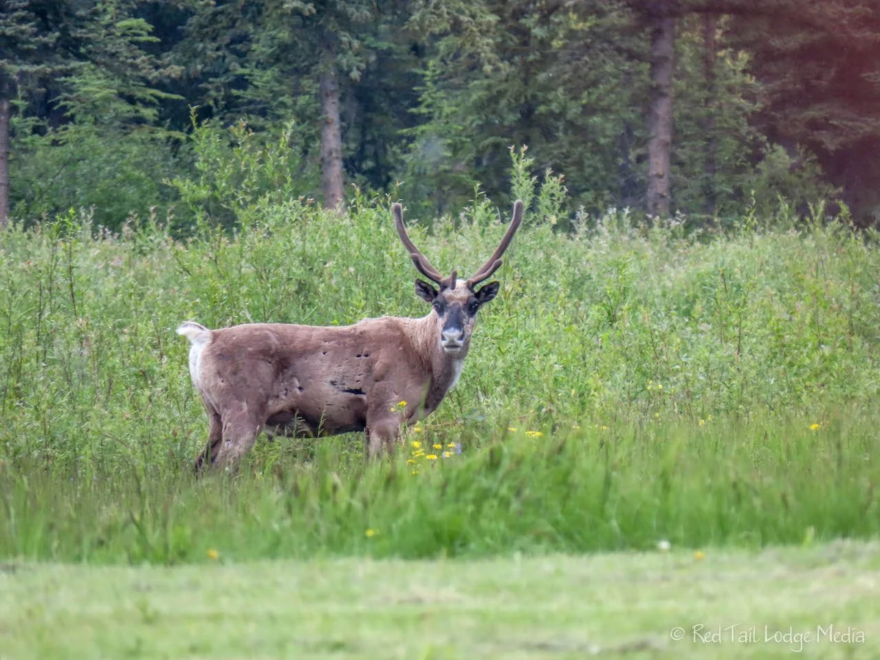While we were sitting there socializing, a caribou wandered into the meadow nearby. Of course, Ann grabbed her camera and started shooting. The caribou hung out in the meadow for quite a while. He seemed to notice that Ann was looking at him. Even though she was quite a distance away from him, standing on the porch of the building, he kept looking up at her. Perhaps he was just trying to pose for the pictures.
