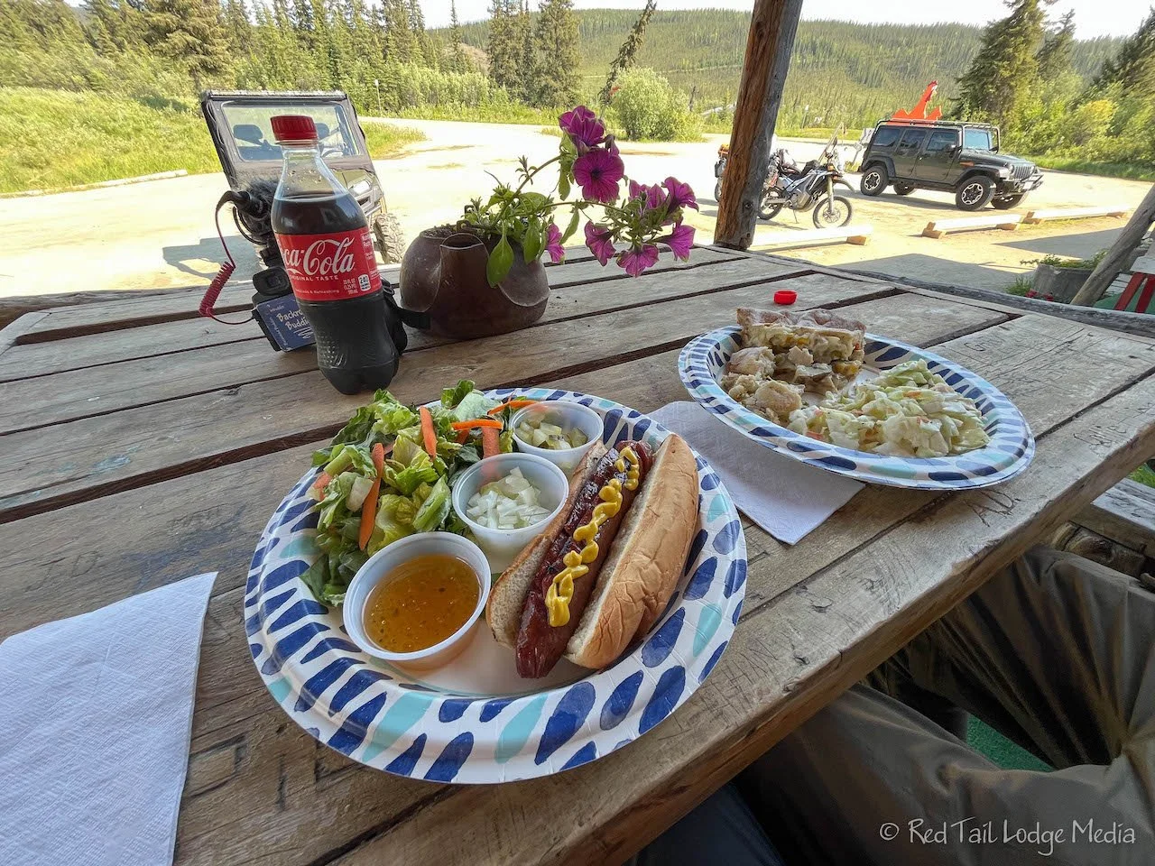 We walked into the Chicken Creek Cafe. It was only 3:45 pm, but the cafe was closing at 4 pm. Some limited items were available afterwards in the saloon, but Ann was eyeing the elk bratwurst for dinner, which was not one of the items offered in the saloon. Since it was 4:45 pm Yukon time (we gained an hour when we crossed the border), we decided to have an early dinner. There were no grocery stores in the area and we didn’t have much in the van to make dinner with. Pasta is usually our standby meal, but we were out of cans of tomato sauce, bad planning on our part.