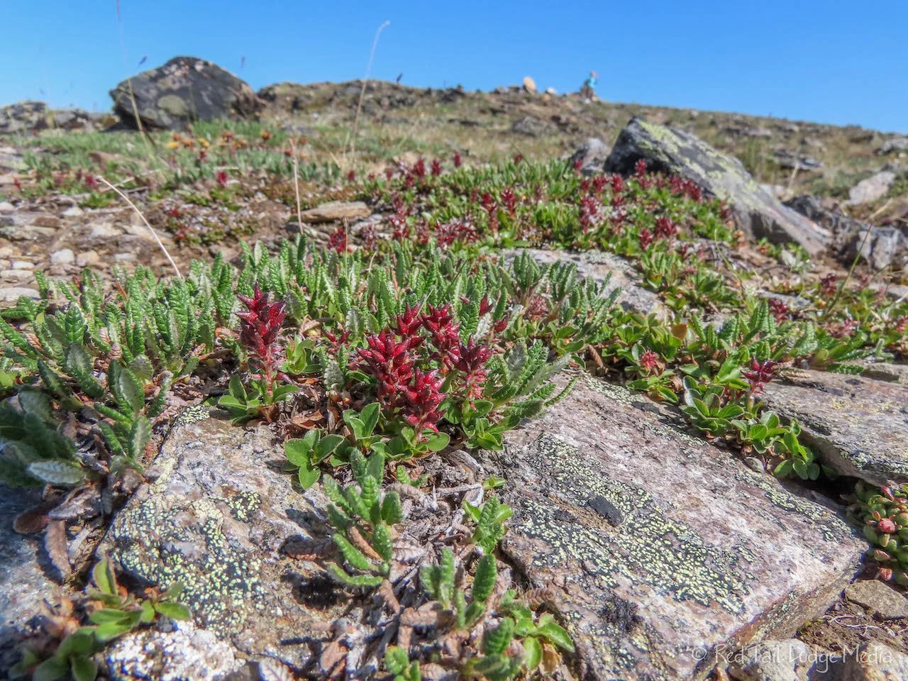 The stop we enjoyed the most was the large pull out just before the border crossing, at mile marker 64.7 (104.5 km from Dawson). There are views of the customs buildings along with great panoramic views. Across the road is a short climb up to a large cairn (pile of rocks). The climb is worth the view. As a bonus, there are a variety of tiny tundra flowers alongside the trail. This is the highest point along the Top of the World Highway.