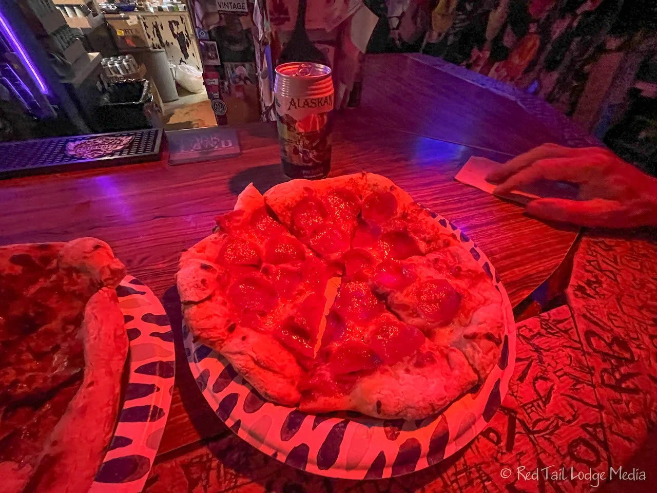 At 6 pm, we headed over to the Chicken Creek Saloon. It was time for our pizza reservation. The saloon was small. Inside the walls and ceiling were covered with ball caps, bandanas, and ladies underwear. On other walls were license plates, patches, and business cards. A couple of patches caught our attention. One was a fire department patch from Vestal, New York, an area we used to live in a few decades ago. The other was a police patch from Broomfield, Colorado, where our home is now.