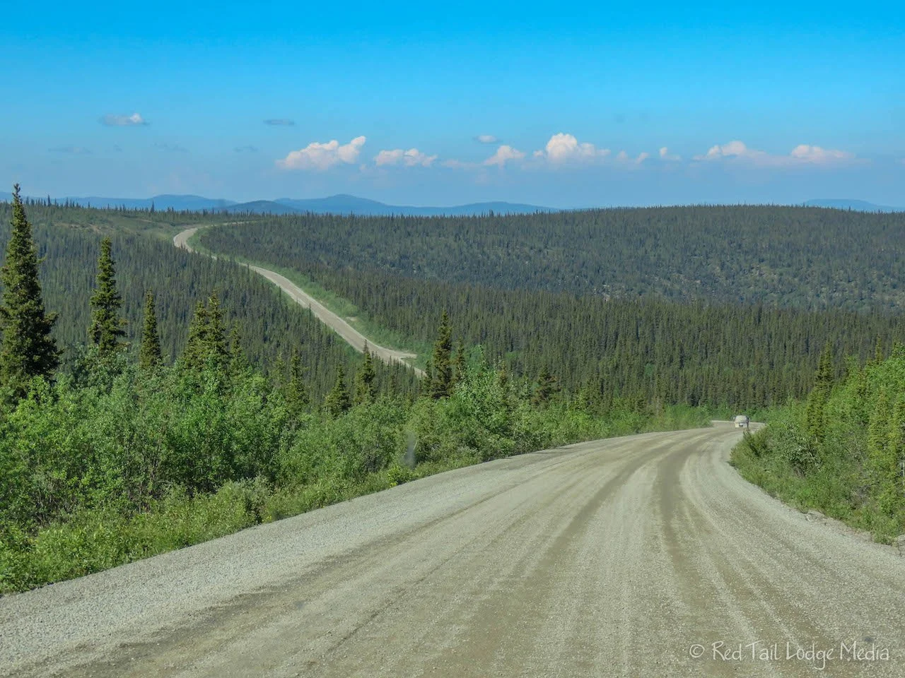 The road was paved briefly from the border until it met up with Taylor Highway. Once you cross the border, the name of the highway changes from Top of the World to Boundary Spur Road. Thirty miles later, the spur road intersects with the Taylor Highway. To the right, the highway goes to Eagle. To the left, the highway goes to Chicken and beyond. On the Taylor Highway, we found ourselves on gravel again. Instead of the wide-open views of the Top of the World Highway, the Taylor Highway winds its way as it descends into valleys, following a stream most of the way. Very scenic. The color of the water of the stream was very dark brown. We’re guessing it is that color from the tannins of the trees, just like we saw at Tahquamenon Falls in the Upper Peninsula of Michigan the year before (Tahquamenon Falls State Park, Michigan - July 19th, 2021).