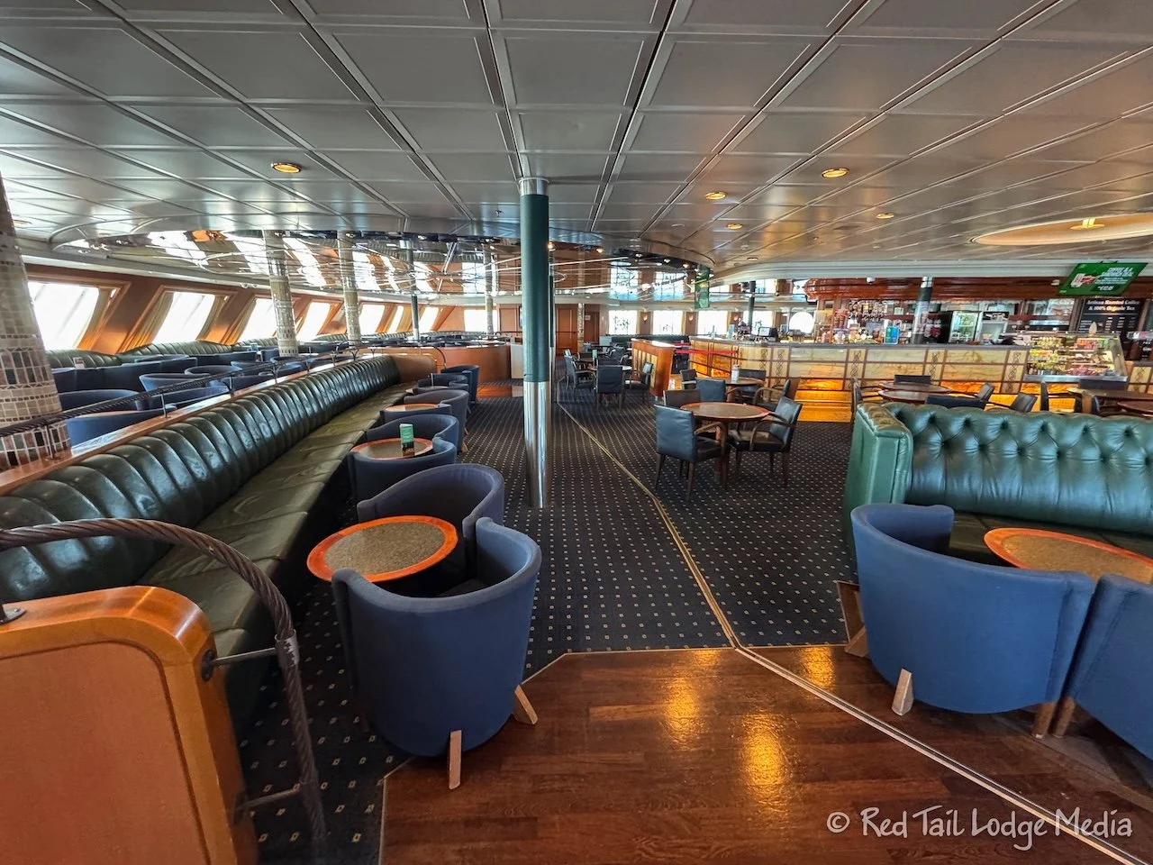 The Ulysses felt more like a cruise ship, with several decks of comfortable seating and cabins. In addition, there was a duty-free shop, a movie theater, a bar, a brasserie (restaurant), and a cafe. We’re not sure why you would book a cabin for a three and a half hour ride, but we did see a motorcycle rider check out of a cabin when we arrived in Holyhead.