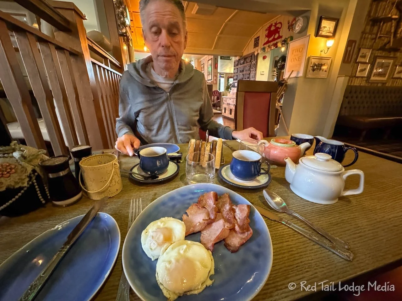 Wednesday morning, we headed downstairs for breakfast at 8 am. Breakfast was served from 8 to 9 am. There seemed to only be one other person staying in the hotel, or at least having breakfast. There was a small buffet with cereal, orange juice, and condiments. There was no breakfast menu. A waiter came over and asked what we wanted for breakfast. We assumed that anything in a full English breakfast was fair game. From our experiences so far, we knew a full English breakfast consisted of eggs, bacon (English), sausage, baked beans, black pudding, a grilled tomato, mushrooms, and toast. So Ann ordered two fried eggs with bacon while Keith ordered toast. The waiter didn’t ask whether Keith wanted white or brown bread, as had been customary since we’ve been in England, but he brought out three slices (cut in half) of three different types of bread. Keith split the toast with Ann. We both had butter and black current jam on our toast, as black current has become our favorite type of jam.