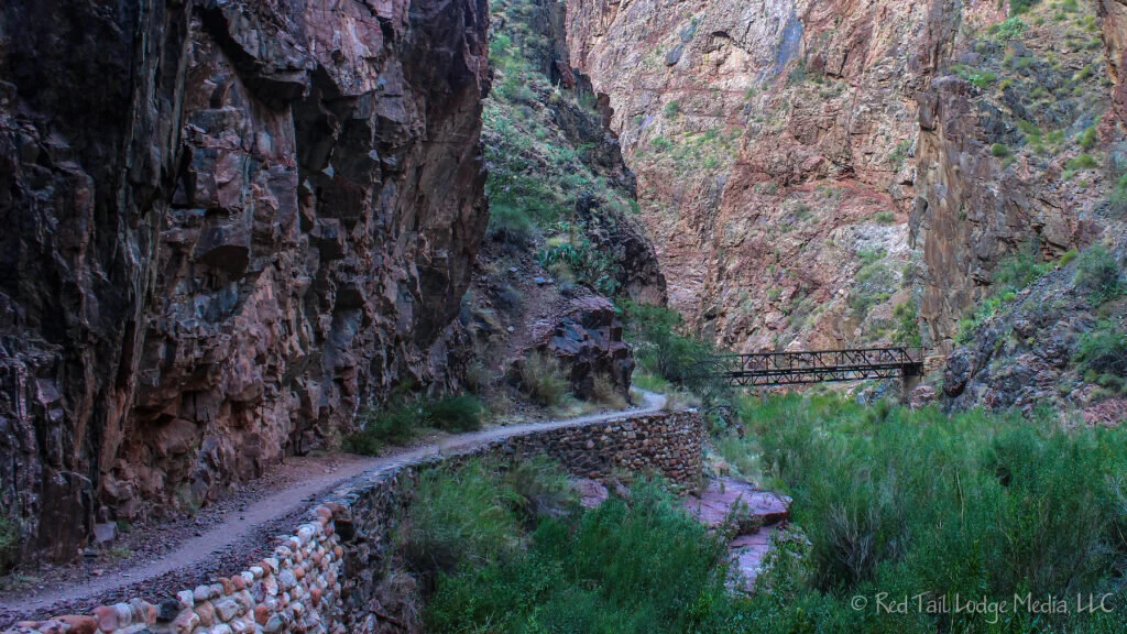 The spur trail to Ribbon Falls is a little over a mile from Cottonwood Campground. From our research and talking to other hikers, we knew the bridge over Bright Angel Creek on the spur trail to Ribbon Falls has been out since March 2017 (National Park Service News Article). It was damaged by debris from a storm-caused rockslide. There are no immediate plans to repair or replace the bridge. We also knew that people had made a trail around the bridge which required fording the creek on foot. It was about 5:30 am by the time we reached the damaged bridge and it was still dark.