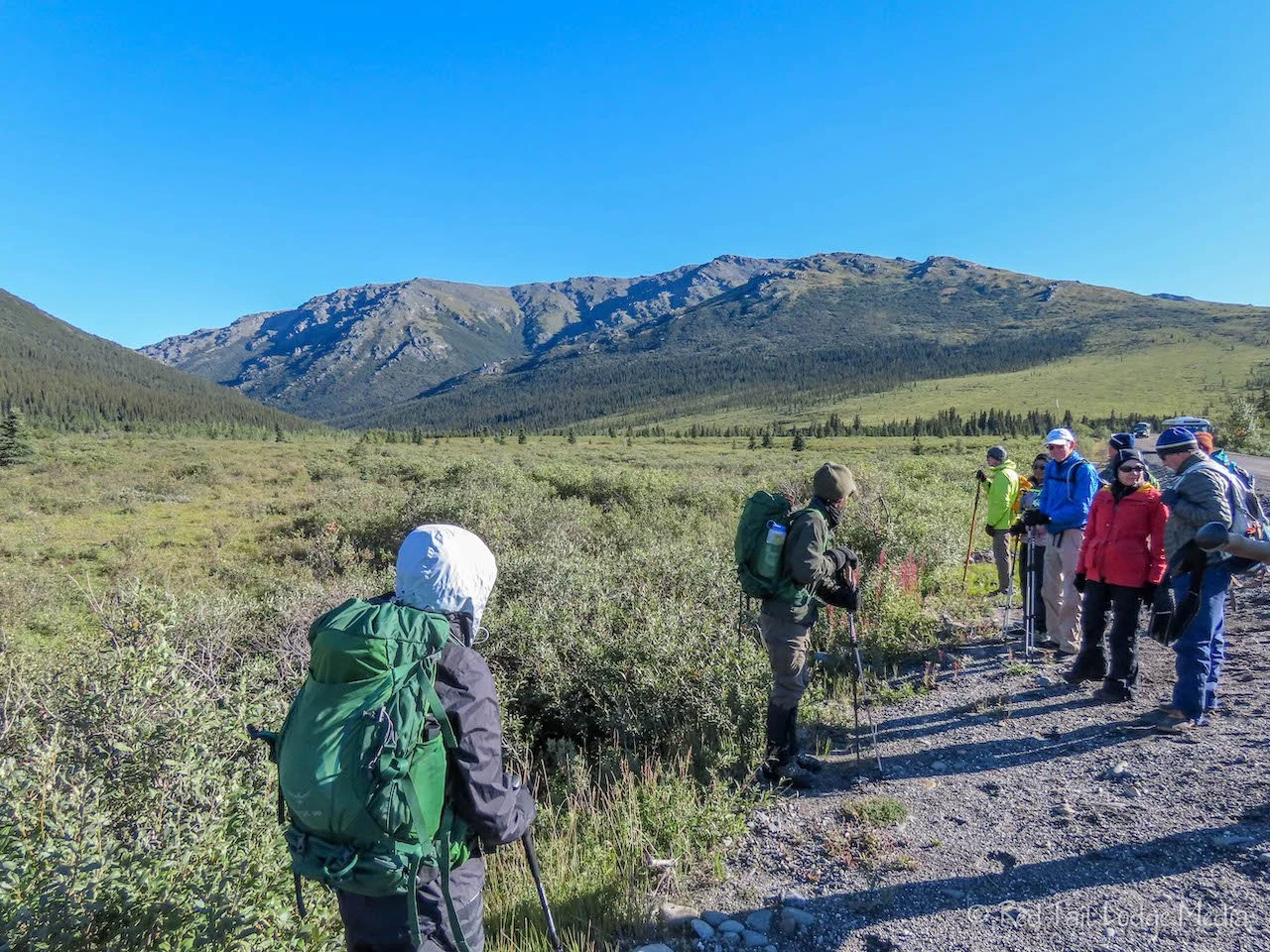 The bus drove about seven to eight miles from Savage River on the Park Road and dropped us off alongside the road near Sanctuary Canyon, about half a mile before Sanctuary River Campground. Ranger Brian talked to us for a little while, giving us safety instructions, such as bear safety and how to use bear spray. He also showed us the equipment he had in his pack including satellite communication devices, in the remote chance he became incapacitated.