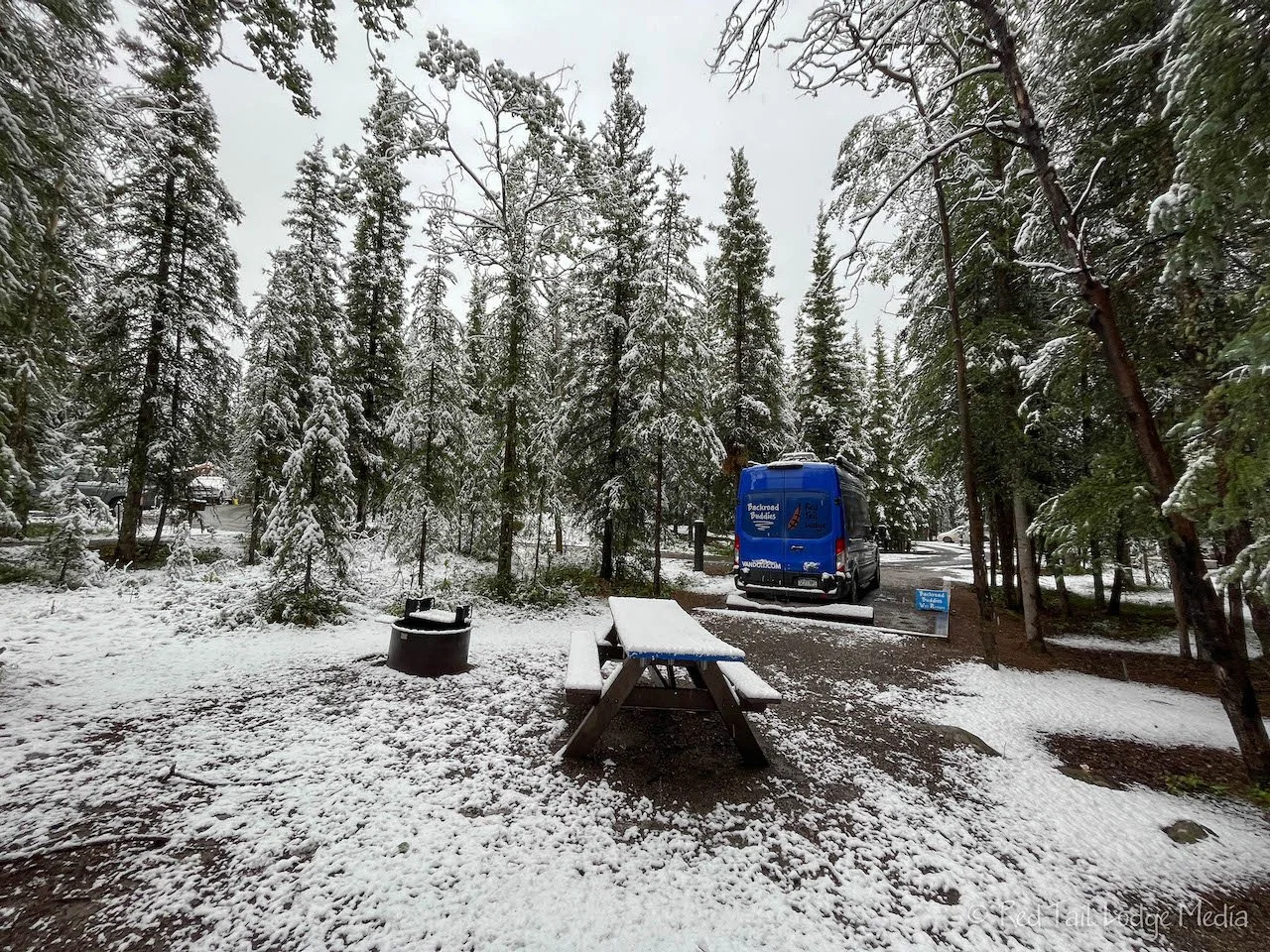 As Ann was getting dressed Tuesday morning, Keith heard a noise while still laying in bed. He thought it sounded like something brushing up against the van. Concerned it might be a bear, Ann peaked out the front curtain before opening the sliding door. There was a blanket of snow about an inch deep over everything. The noise must have been snow sliding off the van.