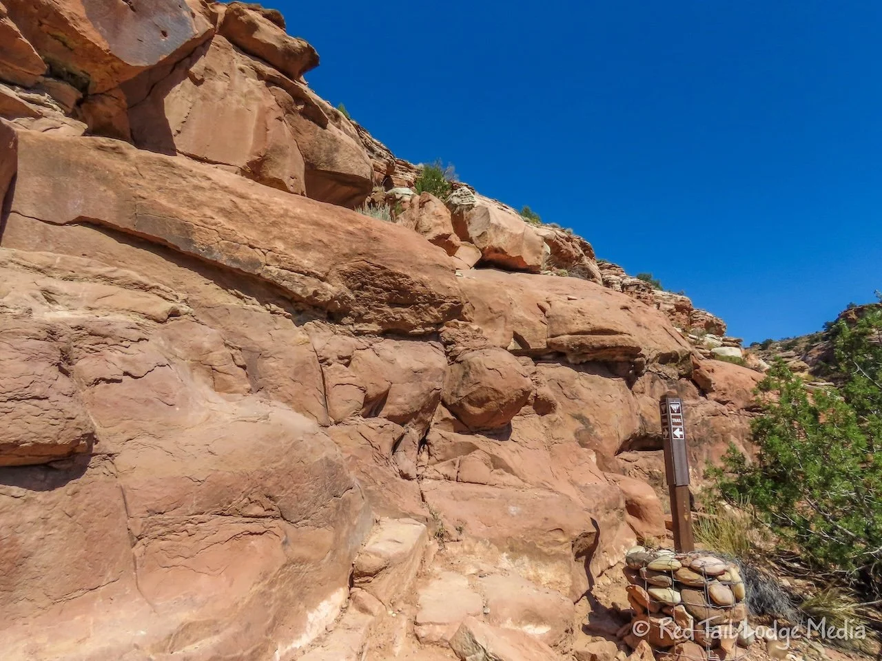 We followed the route on AllTrails, or at least tried to. We got off route on the way up, so we unknowingly missed one of the petroglyph panels, but we found it on the way back down. However, we never did find the 100 Hands panel. The trail is not maintained, so there isn’t much signage to help you out. There were two other small groups of people also looking for the panel. None of us found it. One person said they had even been there before and found the panel, but they couldn’t remember exactly where it was. So we all gave up.