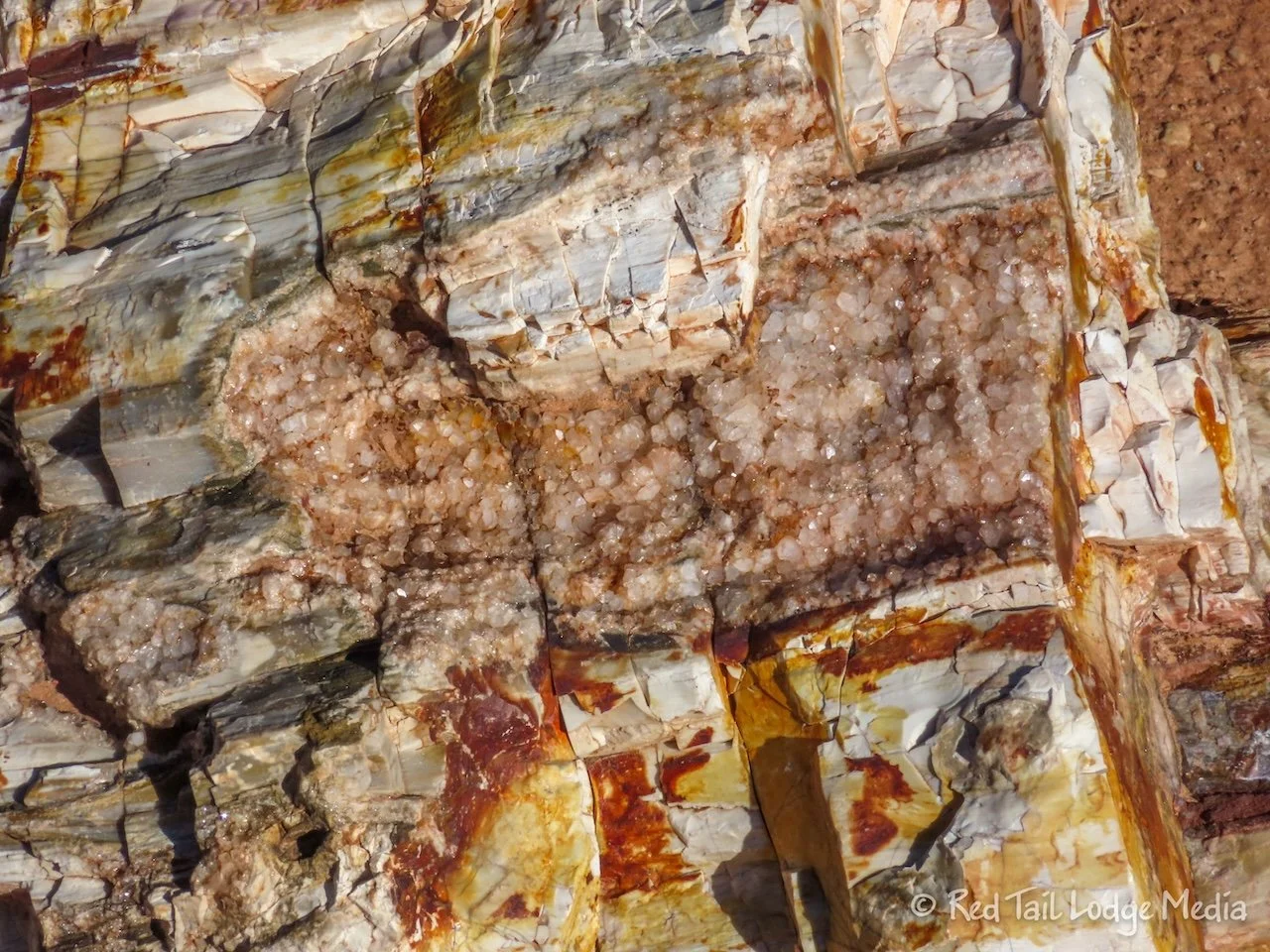 As the name of the park and trails imply, the highlights of the trails are the petrified wood along the way. However, there are also some nice specimens at the trailhead, no hiking required. There is a nice, long, broken log in front of the bathhouse and another long tree trunk laying in an elevated area next to the parking lot. A short path leads to a group of petrified pieces. One of them had beautiful, sparkling crystals in it.