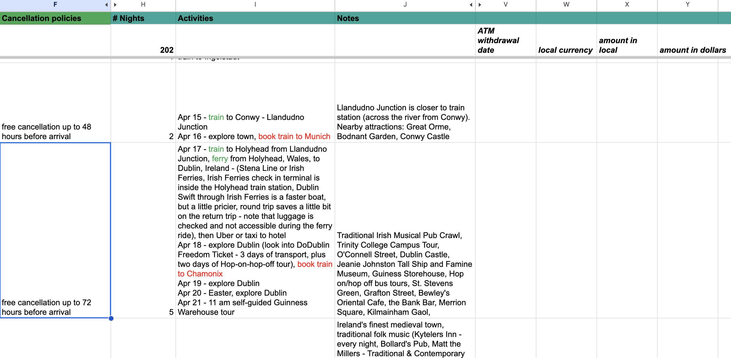 For Europe, we packed more information into our spreadsheet than ever before. There were notes for local transportation, reminders to get more local cash, counting the days we were in the Schengen Area (we had three days to spare!), keeping track of which days we were using our Eurrail Passes, what attractions we wanted to see, what lodging was already paid for and which ones we still owed a balance, and how much cash we were taking out of ATM’s along with when and where. We even noted cancellation policies for our reservations, just in case we needed to change plans along the way. If there was something about the trip that we wanted to track or remember, we added it to the spreadsheet. Similar to our previous trips, we used color coding to help us. If we’ve already paid for something, the amount would be in green. If there was something we needed to pay special attention to, like remembering to make a reservation or a balance that needed to be paid, it would be in red.