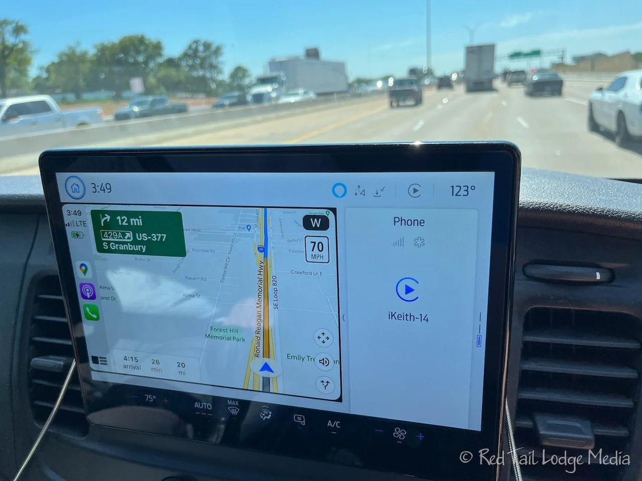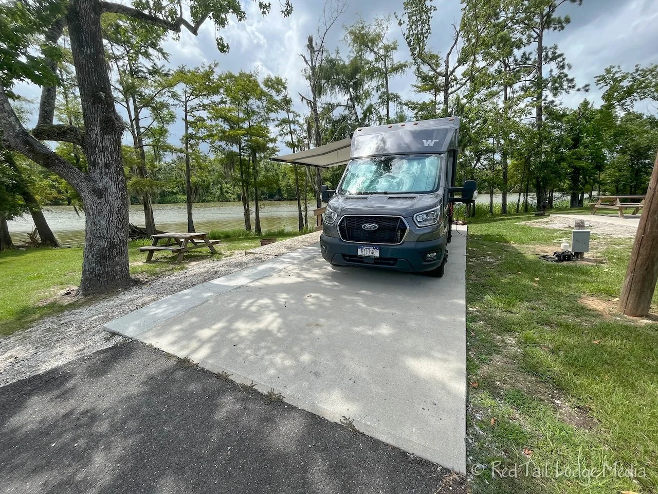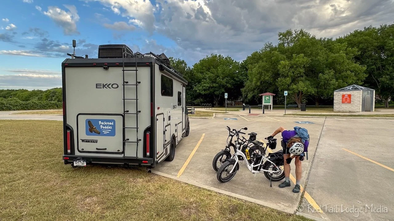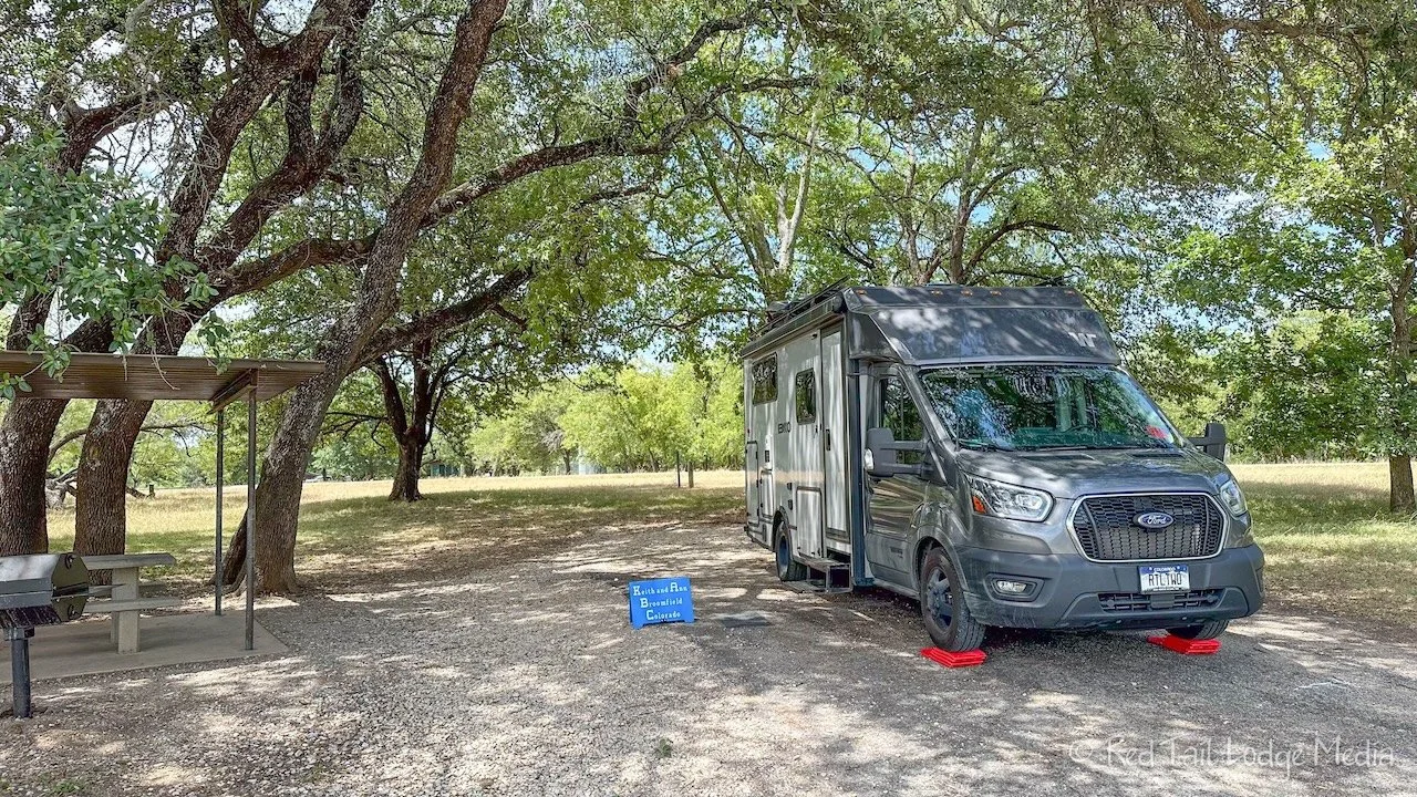 Wednesday was a long drive for us, about six hours of driving, from Nibletts Bluff Park to South Holiday Park on Benbrook Lake in Fort Worth, Texas. For lunch, we stopped at a Whataburger. We had to. We’re in Texas, right? It was another hot day, really hot. While we were on the interstate, approaching Fort Worth, we watched the temperature rise. It was 100, then 110, then it was increasing about a degree a minute or less, until it reached 123 degrees. Yes, you heard that right, 123! That’s insane! Then it finally started backing back down. Luckily, by the time we set up camp, in the shade, by the lake, away from the hot pavement, the temperature was back down to 103 degrees. Ann is worried that Keith will never forgive her for scheduling a visit to Texas in July. Needless to say, Keith didn’t leave the air conditioning of Red Tail the rest of the evening.