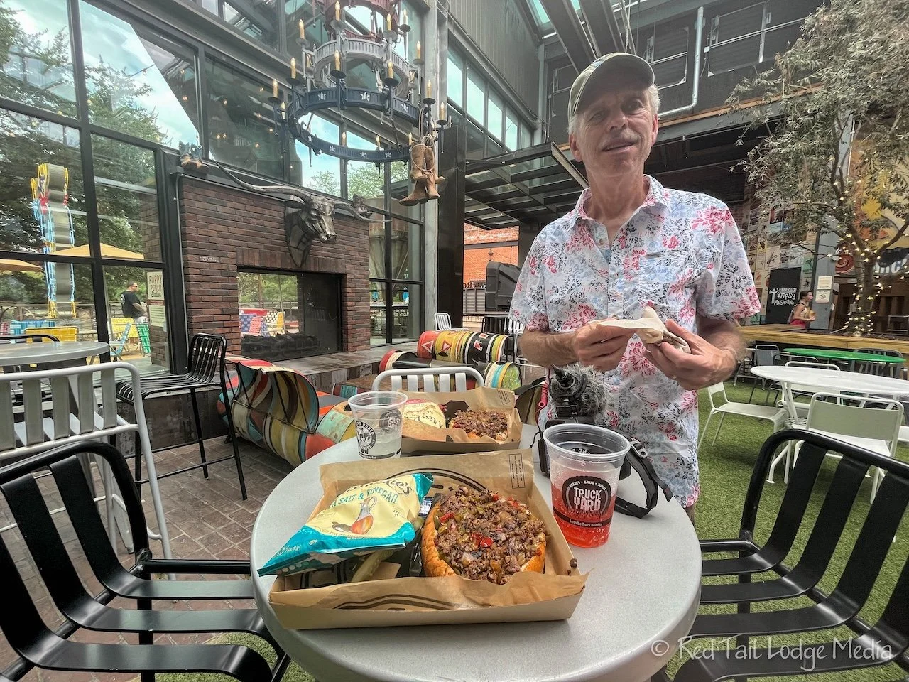 After our cool down, we ventured outside again. This time we headed over to Stockyards Station to see the different brick ramps that our tour guide talked about, built to help keep the cattle from slipping on the ramps. Then we went back to Second Rodeo Brewery for more drinks and to listen to the live music. We spent several hours there. At first we found a shady spot in the Truckyard, right in front of a large fan. But, after a while, even that got a little toasty, so we went inside. We could still hear the music inside.