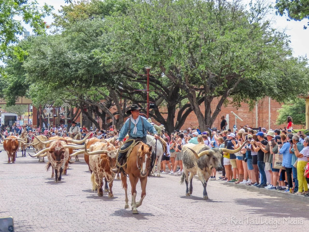 We slept in a littler longer on Friday, getting up at 7:30 am. We drove over to the Stockyards to explore, arriving just in time to join the 10 am walking tour. It is always nice to learn a little history and stories about the places we visit, making the sights more engaging. The tour ended just in time to watch the 11:30 am cattle drive down Exchange Street. The City of Fort Worth owns a herd of pure long horn cattle which is housed at the Stockyards. Normally they have a cattle drive twice per day, but the 4 pm drive was cancelled for a while due to the extreme heat. It was another scorcher of a day, with temperatures in the 100’s starting in the afternoon.