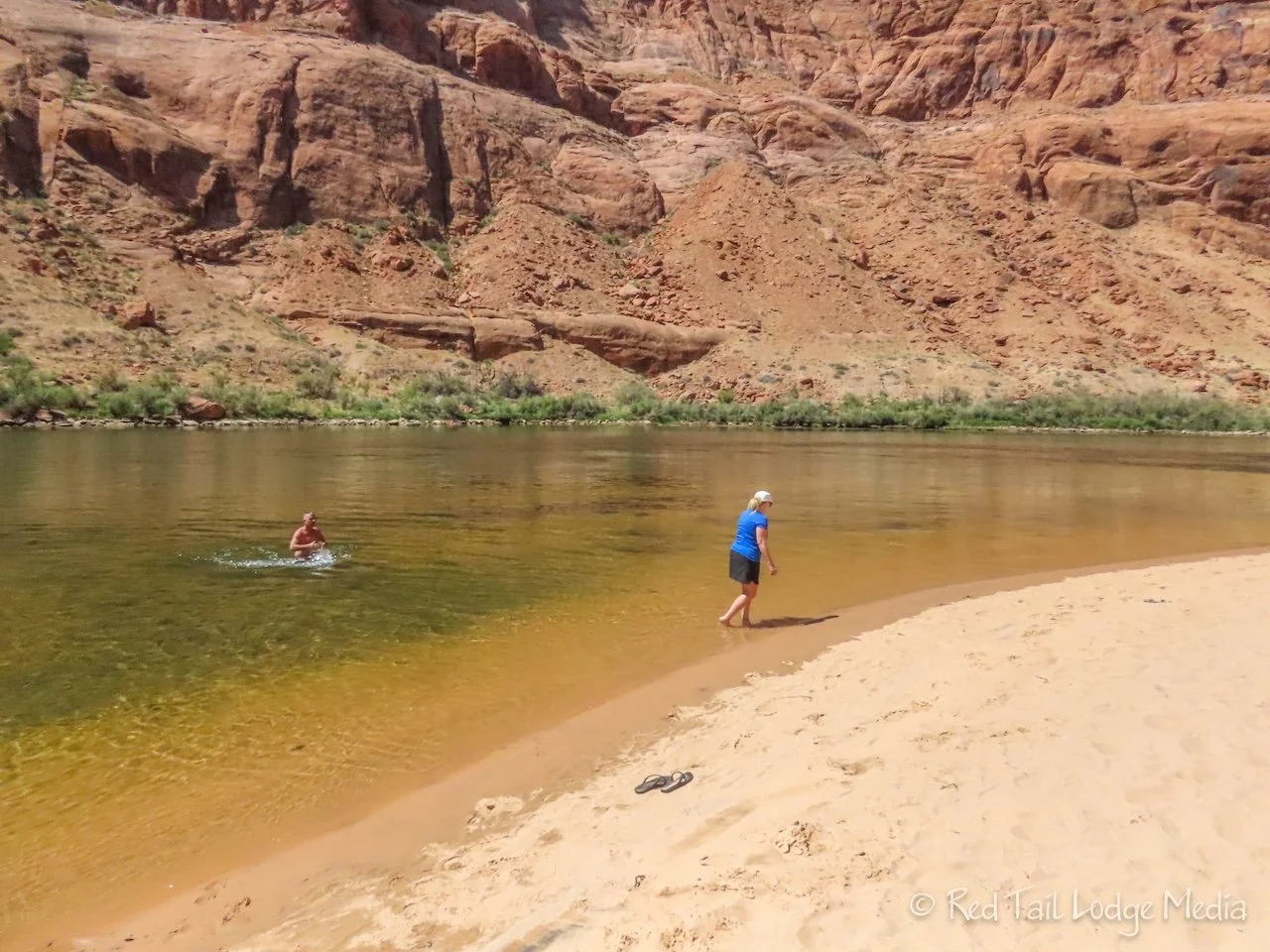 The tour gives you time to take a quick swim in the cold river. Normally the river stays between 47 and 52 degrees, but it has been a rather warm summer. So the water temperature was closer to 58 degrees. That’s still pretty chilly. To no one’s surprise, Keith opted to stay out of the water. However, Ann took off her shoes and waded into the water a little bit. She regretted not going completely in. It would have felt good in the heat as it was in the 90’s. Getting her clothes wet would not have been a problem. They probably would have completely dried by the time we reached Lee’s Ferry.