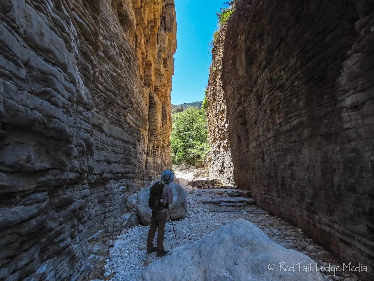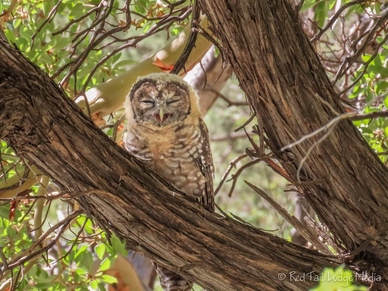 We heard an unusual noise that we were pretty sure was coming from a bird. As we tried to identify the source of the screech, we saw them, three owls in a nearby tree. Not far after that, we reached a sign at the start of where the canyon turned into a tall, narrow passageway. Ann didn’t read the sign and thought it was the sign indicating the end of the trail, so she suggested going back to a stepped rock layer in the shade to eat our snacks, just past the water pool.