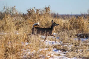 Hike 6 was a total of 5.7 miles with 135 foot elevation gain in two hours and 40 minutes on December 3, 2019. Our hike was two separate hikes, First Creek Trail and Locust Loop Trail. There was some soft snow and mud on parts of the trails. RB used gaiters, but they were not needed. The temperature was in the upper 40’s and low 50’s. There is no entrance fee for the Rocky Mountain Arsenal National Wildlife Refuge. We saw a lot of wildlife: prairie dogs, bald eagles, a ferruginous hawk, mule deer, white-tailed deer, and bison. For the First Creek Trail, we parked at the lot outside of the refuge at the southeast corner on E. 56th Ave, just west of Pena Boulevard. From there it is a half mile walk up old Buckley road to get to First Creek Trailhead. The trail goes up to the First Creek Overlook which has panoramic views of the refuge overlooking herds of deer and buffalo with the mountains as a backdrop. There is another trailhead on Buckley road closer to the overlook, but the trail is probably a little more scenic than the old road, even though vehicles are no longer allowed on Buckley road. After hiking First Creek Trail, we ate our lunch in the van. RB forgot to pack her lunch, but LB gave her one of his three granola bars and she took another one from our emergency stash in the van sink cabinet. After lunch, we took the eleven-mile Wildlife Drive around the refuge before parking at the Locust Loop Trailhead near Lake Mary. It was during our drive that we saw all the buffalo. The refuge keeps the buffalo in a separate fenced off area (quite large), that you can drive through, but you are not allowed to leave your vehicle. The refuge is 15,000 acres located within sight of downtown Denver. The property was originally farmland, then a chemical weapons manufacturing facility, then an agricultural chemical production site, then used for Cold-War weapons production and demilitarization before becoming a wildlife refuge in 1992. However, the environmental restoration was not considered complete until 2010 (Rocky_Mountain_Arsenal). From the Locust Loop Trail, we headed up the Army Historic Trail to the flag pole which is near where the U.S. Army’s headquarters building once was. There were descriptive markers along the way. The locust grove was started by farmers. An old farmhouse, once occupied by the Egli family, still stands near the trail, the last one remaining from the 200 families who once lived in the area. We had to walk through a small herd of deer along the Locust Loop Trail and the Army Historic Trail. They did not seem in any hurry to get out of our way. It is refreshing to know that an area can be cleaned up and used to allow wildlife to thrive. The density of wildlife we saw that day seems to confirm that the animals are doing well here.