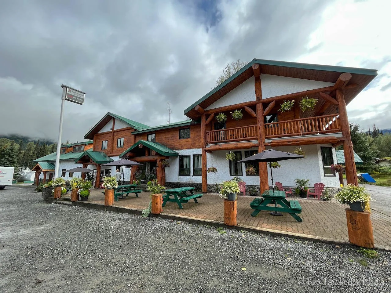 Other than a couple of rest area stops, the only real stop along the way we made was at the Bell 2 Lodge for a mid-morning snack. The lodge looked rather nice and modern. There were cabins, an RV park, and several helicopters parked next door. The signs indicated the helicopters were for heli-skiing. We bought a couple of chai lattes and a few homemade cookies. Unfortunately, the little cafe did not have any seating indoors and the tables outside were all wet, so we ate our goodies inside our Red Tail Lodge (our camper van). A sign indicated you could buy wifi access, by the hundred megabytes. It was tempting since we hadn’t had cell service in over five days, but we passed. We’ll be driving into Stewart tomorrow where we should have cell service.