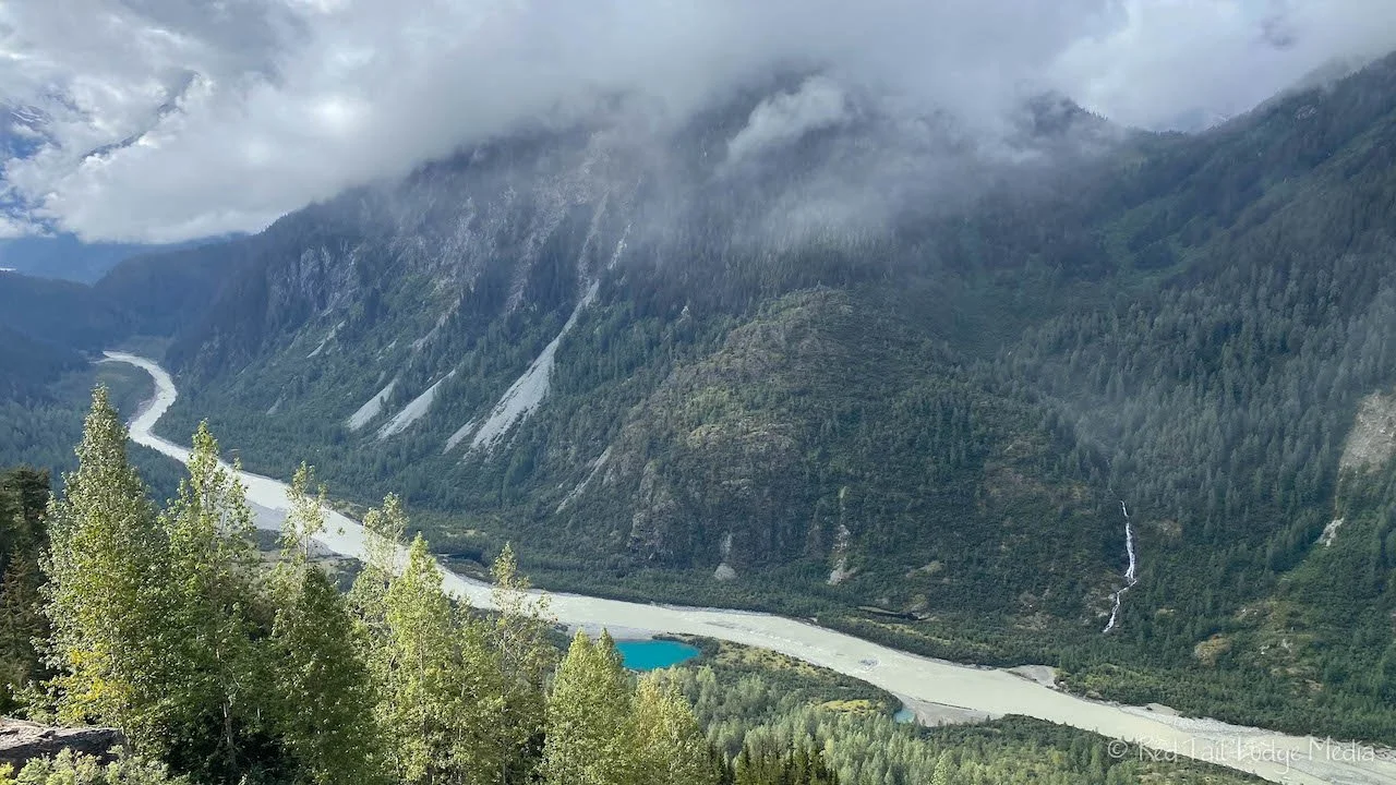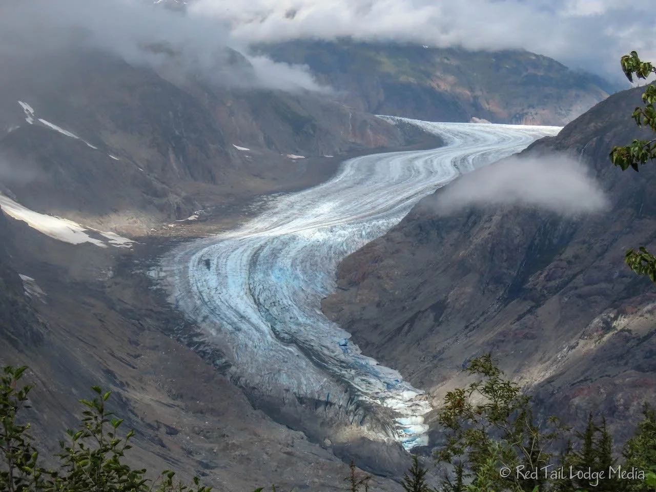 It takes about an hour to drive from Meziadin Lake to Stewart. It is a gorgeous drive through a narrow valley surrounded by beautiful mountains. Along the way is the Bear Glacier which is visible from the highway, at least if fog and clouds are not hiding it. On our way to Stewart, we could see the lower half of Bear Glacier, but the top half was hidden by clouds.