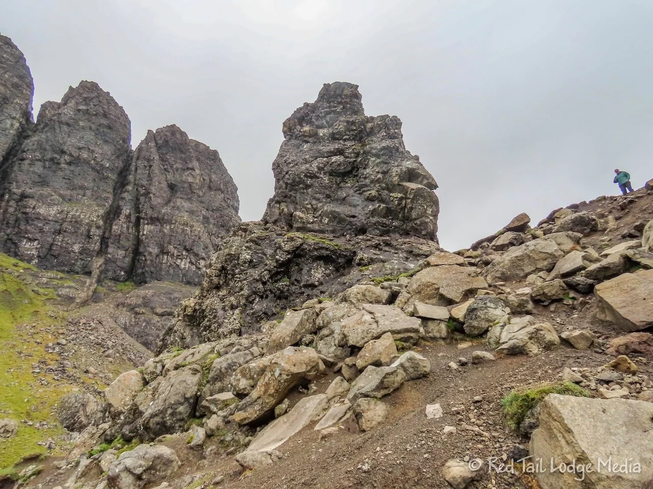 It is a steep trail and you can’t really see the Old Man of Storr until you hike up most of the way. When it first comes into sight, you don’t notice it because it blends in with the rocky cliff side behind it. We were following a route in AllTrails which broke off from the main trail and took us up a short spur on the south side of the rock formation.