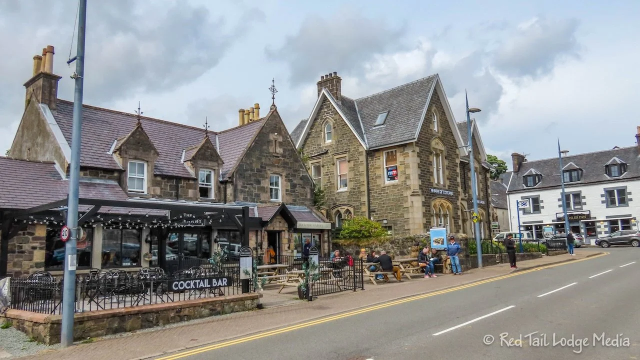 It was about another hour’s drive from Armadale to Portree. We reserved a self-catering pod just outside Portree called Skeabost View Pods. Our check in time was not until 4 pm and it was only about 3 pm when we arrived in Portree. So we parked in the city car park, paid our 3 pounds for three hours of parking, and walked around town to find some place to eat. We had skipped lunch, just munching on flapjacks in the car while we were on the ferry to hold us over.