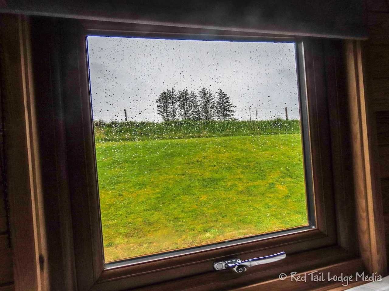 The rain and wind picked up during the evening. We realized how similar the pod was to sleeping in our RV (motorhome). As we lay in bed listening to the rain pounding on the roof and being pelted against the window by the howling wind, we half expected the RV to be swaying with the wind. Oh wait, we’re not in our RV!