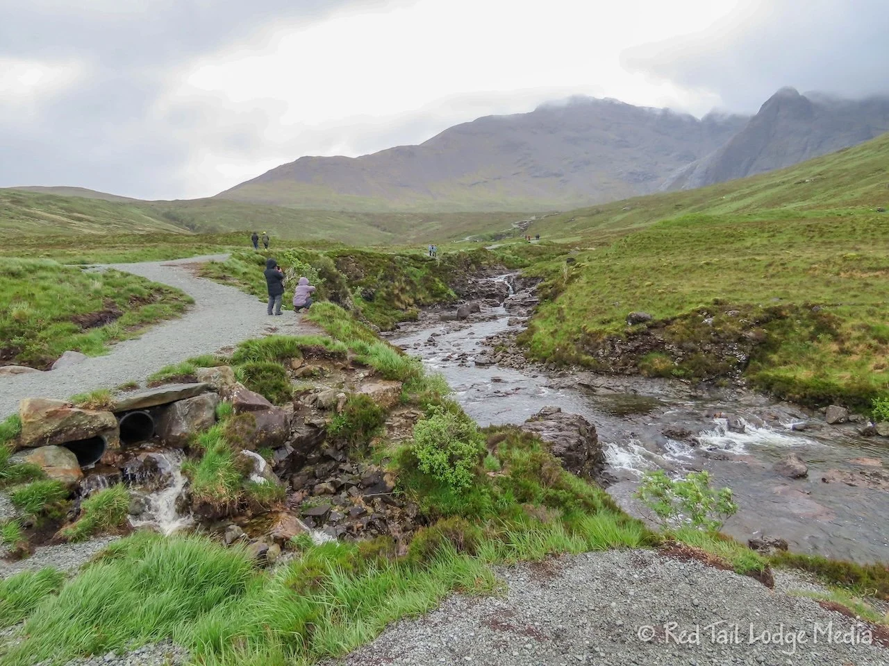 Our first destination was the Fairy Pools, located near the Cùilln Hills on the southwest side of the island. There is a nice crushed gravel trail alongside a stream, the Alit Coir’ a’ Mhadaidh, at the foot of the Cùilln mountains. The stream has a series of waterfalls through jagged rocks. People sometimes swim in the pools beneath the waterfalls, braving the frigid cold water. However, no one was swimming while we were there. The wind chill brought the air temperature down close to freezing.