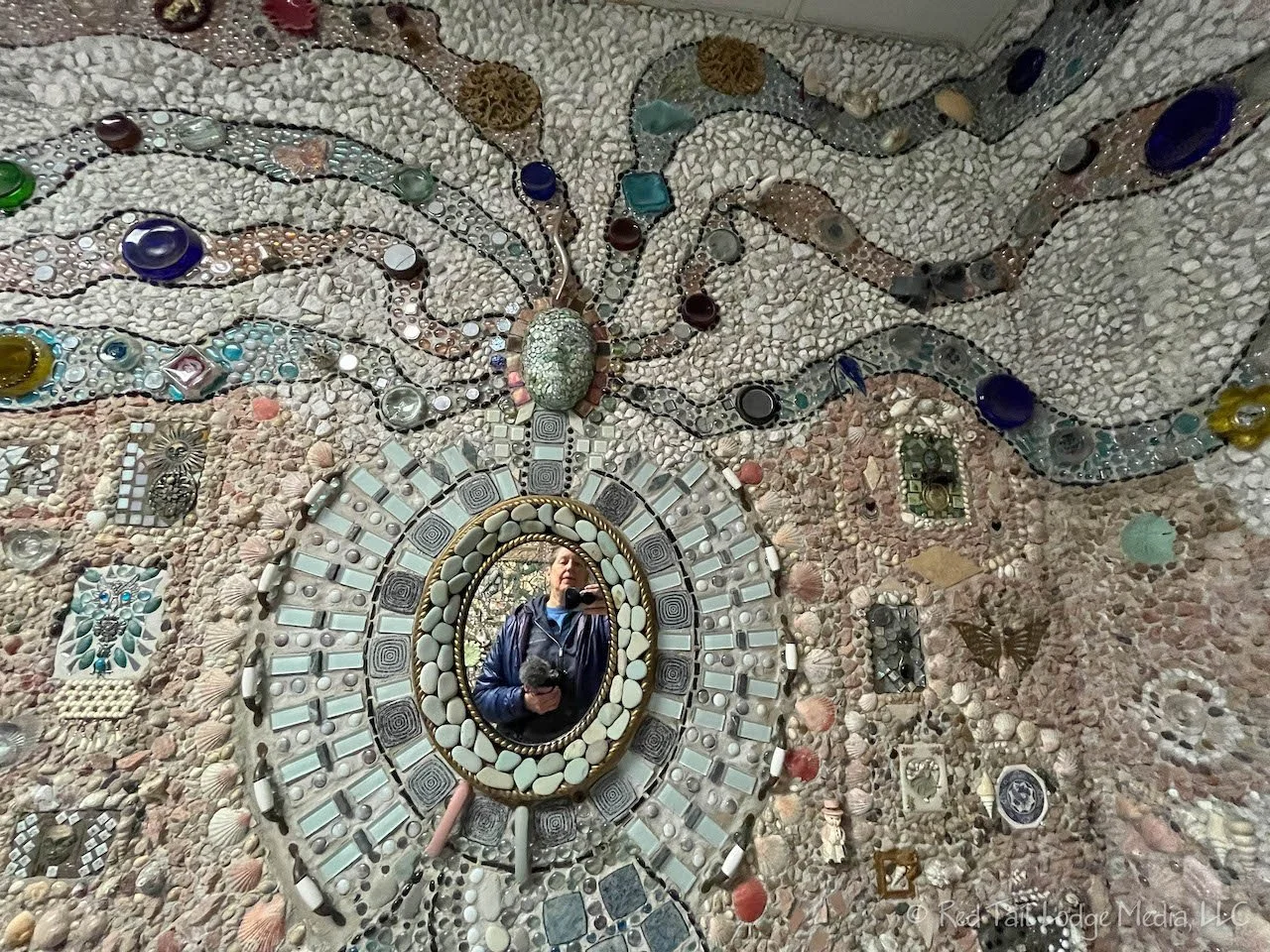 The first attraction we visited was Bowl Plaza, right on Main Street. The building of the public restroom is shaped to look like a toilet, with a flusher in the upper corner of the facade, curved benches in front to look like a toilet seat, a glittery mosaic surrounding the entrance door that looks like the upright toilet lid, and a white sidewalk that ends in a roll to look like toilet paper. Inside, the walls are covered in eccentric mosaics. But yet, somehow, it all looks rather elegant and beautiful.