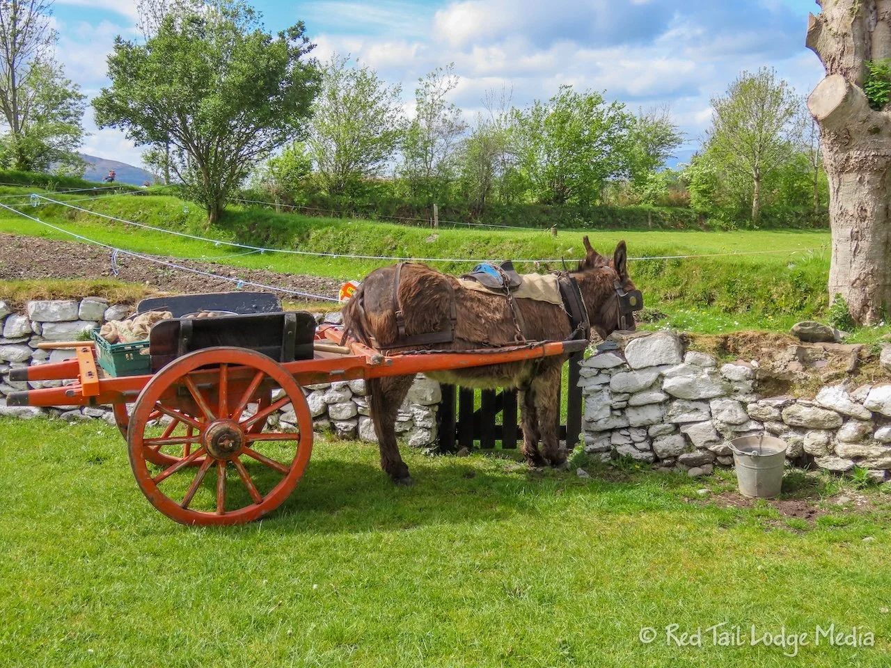 Then we walked over to the Muckross Traditional Farms. The farms consists of a gravel road that circles around for about a kilometer (0.6 miles) that leads you to about half a dozen or so farm buildings. Most of the buildings are replicas of real buildings from the area, before electricity. The buildings included a house on a small farm, a labourer’s cottage, a house from a medium size farm, a house from a large farm, a carpenter’s workshop, a harness maker and saddler workshop, a blacksmith’s forge, and a schoolhouse.