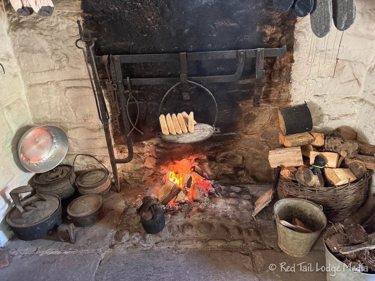 Most of the buildings had a fire going in their fireplaces, fueled by a combination of wood and turf (dried peat moss). Staff members were in most of the buildings. You could sample Irish soda bread in both the small and medium farm houses. In the small house, the bread was made in a frying pan with a lid, on top of the fire. The bread made in the medium farm house was made on top of a griddle hanging above the fire. You can tell the difference between the two breads.
