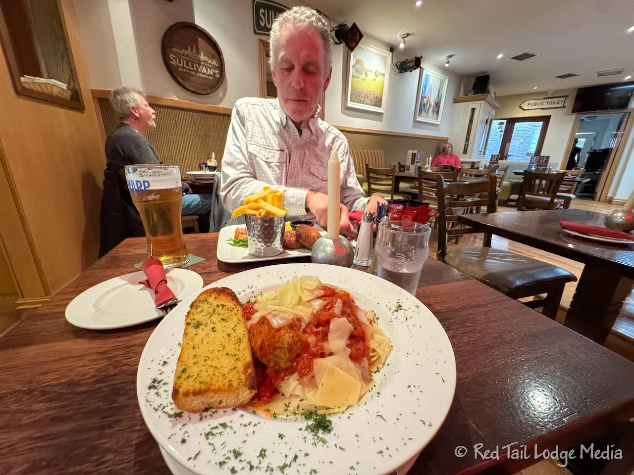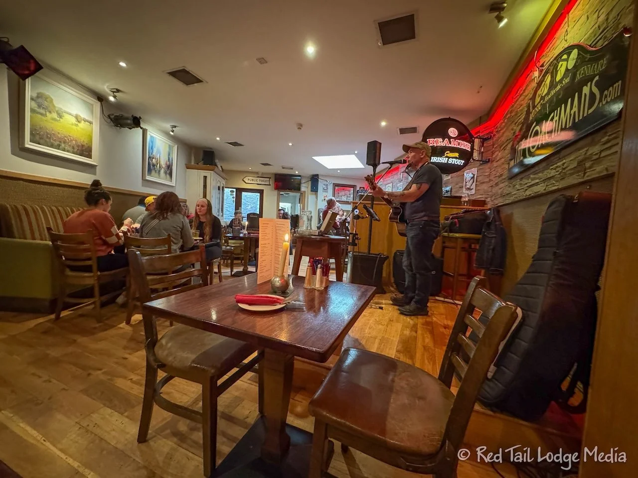 Back in Kenmare, we walked into town for dinner after taking showers. This time we ate at the bar at the Coachman’s. We arrived at 6 pm and traditional music started at 7 pm, so we ate slowly. Ann had the meatballs and pasta, while Keith had their fish cakes.