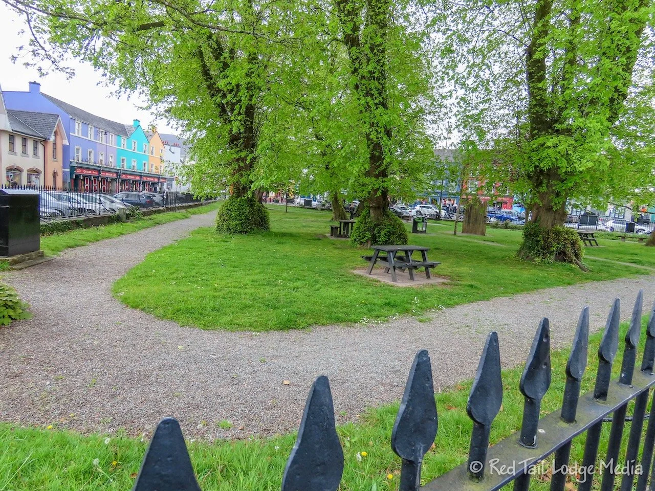 N71 splits into one way streets in town, forming a triangle. The shops, restaurants and bars are along two of the legs of the triangle, Main Street and Henry Street. Just before the split is another small triangle formed by East Park Lane and Park Place. There is a nice little city park inside the smaller triangle.