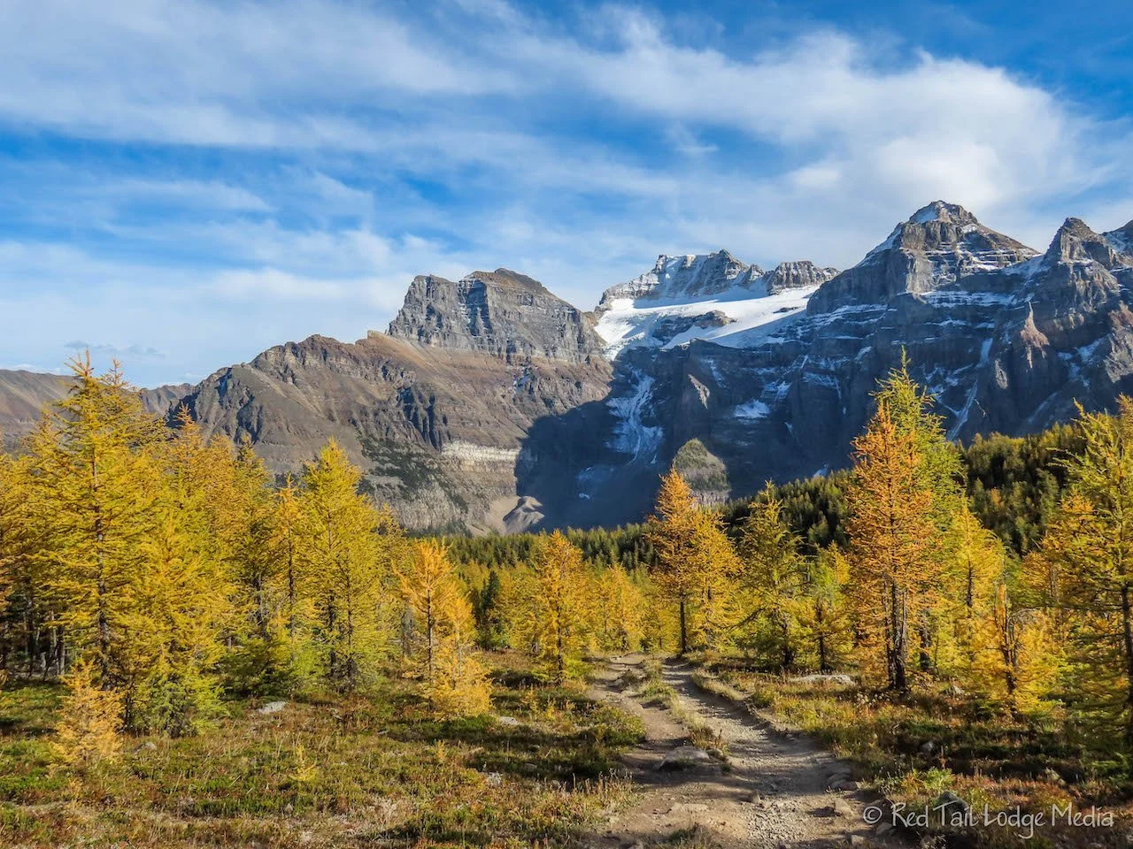 The trail started off pretty similar to the Lake Agnes trail the day before. The trail switch backed up through the woods, with occasional views down to the turquoise-colored lake below, In this case, it was Moraine Lake instead of Lake Louise. When we reached a ridge, the scenery changed. The evergreen trees along the trail changed to larch trees. Then the views opened up across the valley. The valley lived up to its name. There were golden yellow larch trees everywhere. The sunshine made the needles glow against a backdrop of rocky mountain peaks.