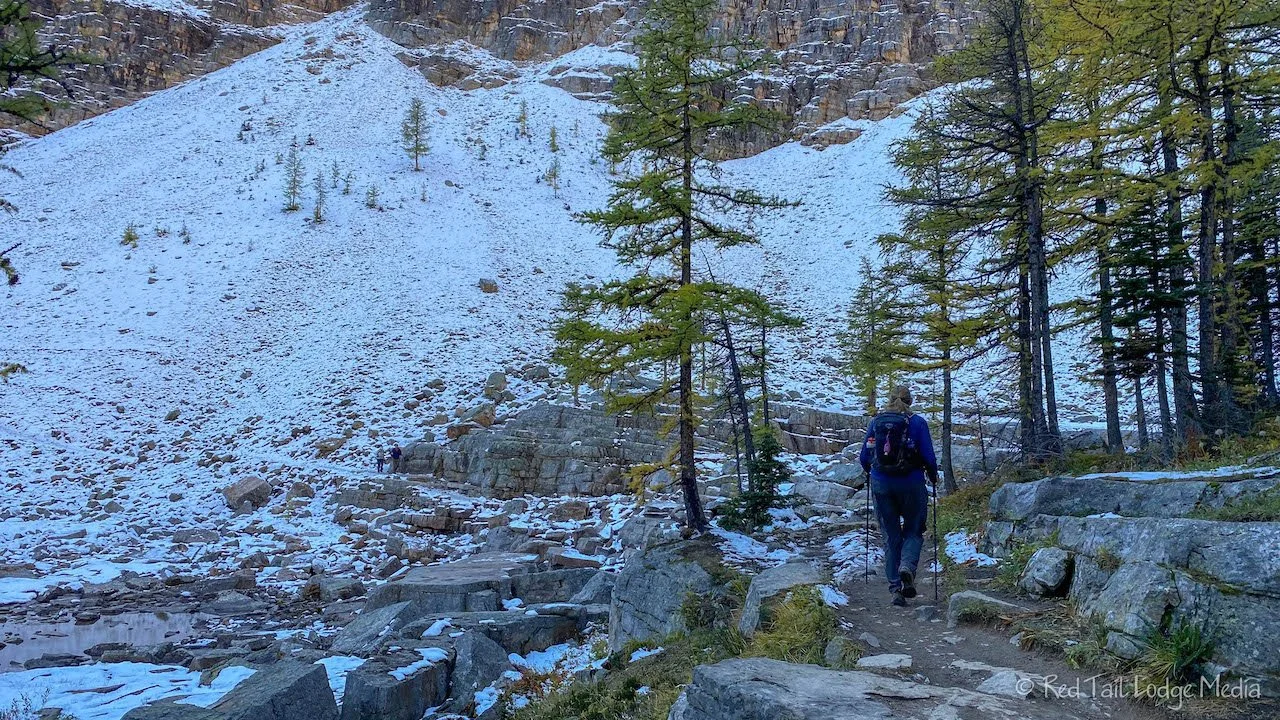 We started up the trail to Big Beehive. It starts out along the shoreline of Lake Agnes, circling around to the other side. However, the other side of the lake was in shadow. It’s probably in shadow most of the day. That meant the trail had snow and ice on it. People we passed coming the other way said they gave up and turned around. We could see people on the steep switch backs moving very slowly. Of course we didn’t bring our Yaktrax (paid link) with us. It was such a beautiful, warm day. Keith was wearing his trail runners (paid link) and not his hiking boots (paid link). We went a little ways on the snow and ice, but turned around once the trail starting climbing. It wasn’t worth risking breaking any bones.