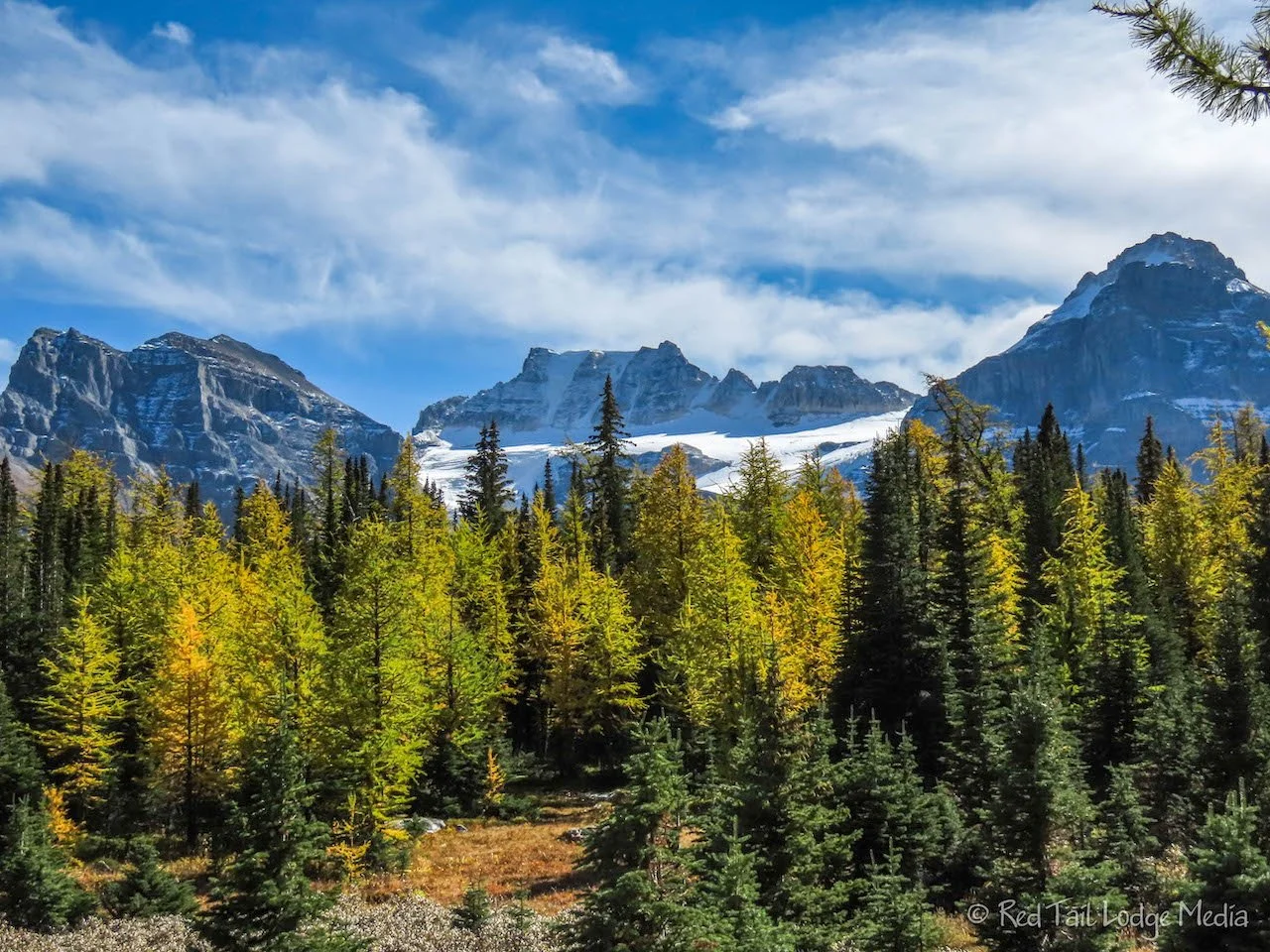 At the teahouse, we decide to head up to the Little Beehive instead. It was a nice trail up to a viewpoint overlooking Lake Louise and down another valley. We could see the lookout over on the Big Beehive from the Little Beehive. The Big Beehive lookout is a little higher and would have better views of Lake Louise, since the sun would be shining from behind the viewer, but the views from Little Beehive were also nice. There were a few larch trees along the way donning their bright, golden yellow fall colors. If you are not familiar with larch trees, they are pine trees that turn colors before dropping their needles in the fall. The needles then grow back in the spring.