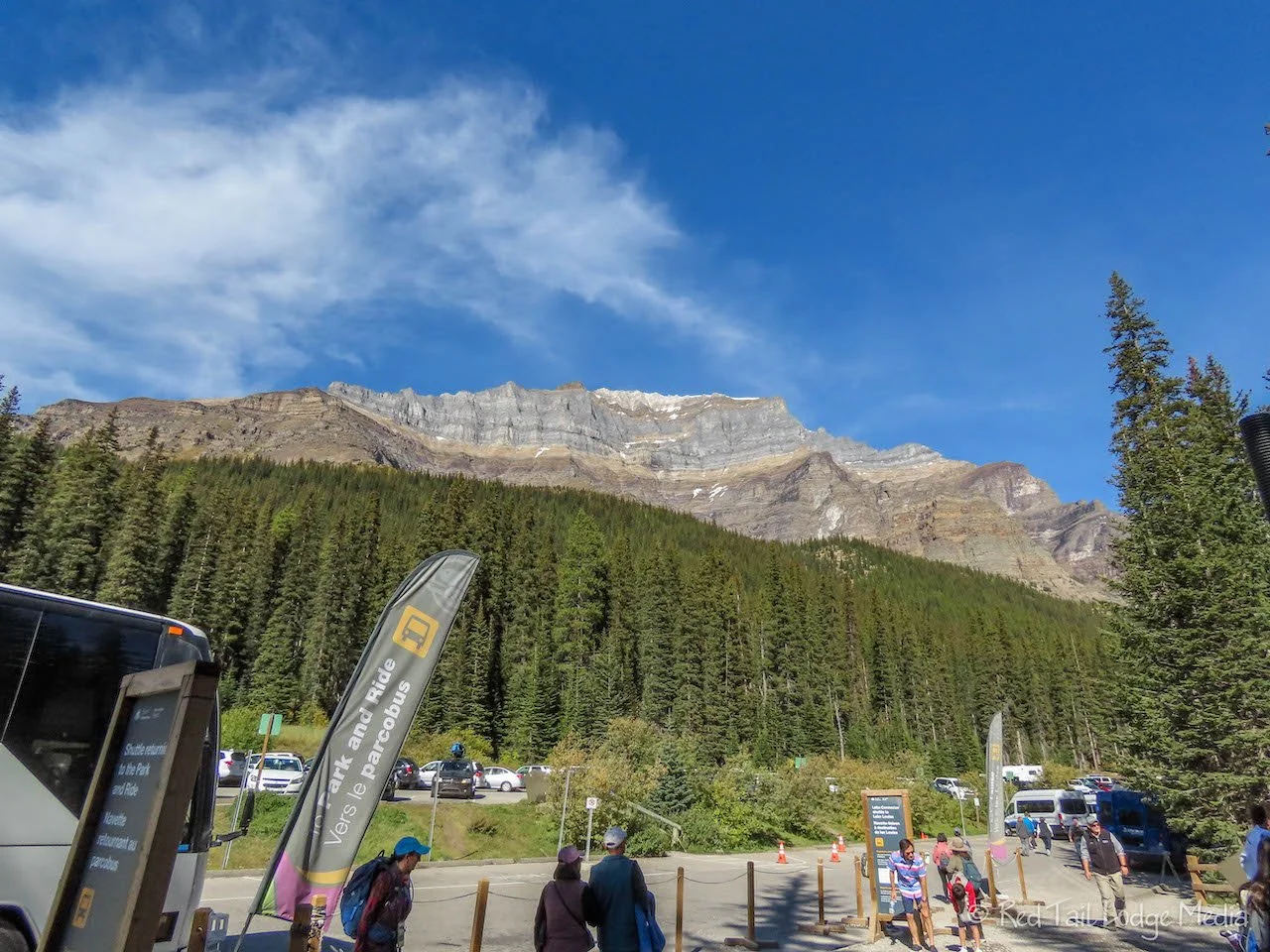 Lake Louise is a popular area inside Banff National Park. The two most popular attractions are the two lakes, Lake Louise and Moraine Lake. In addition, there is a small village, which consists of a gas station, a strip mall, and a couple of restaurants along with the Lake Louise Ski Resort. A few other lodges, bungalows, and cabins are also in the area. Paid parking at either lake is very limited and they do not allow RV’s. There are shuttle buses that are run by the national park that will take you to either lake from the free parking lot at the ski resort. The shuttle costs $8 per person. Reservations are recommended. You reserve a seat within a one hour time slot. Half the seats are available for reservations at the beginning of the summer season. The other half become available on a 48 hour rolling basis, meaning they become available online at 8 am two days in advance.